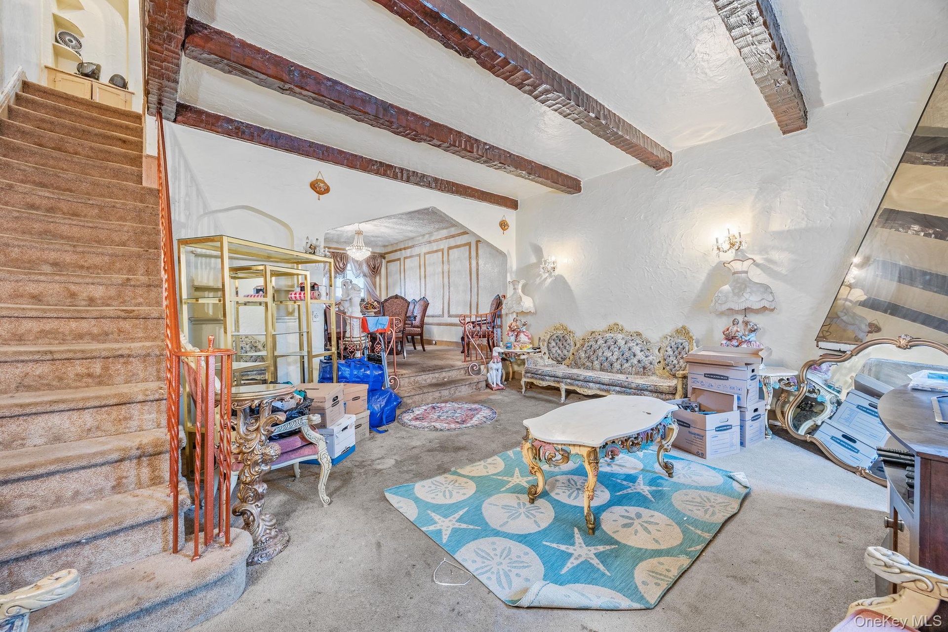 - Living room featuring a textured wall, arched walkways, stairway, and beam ceiling