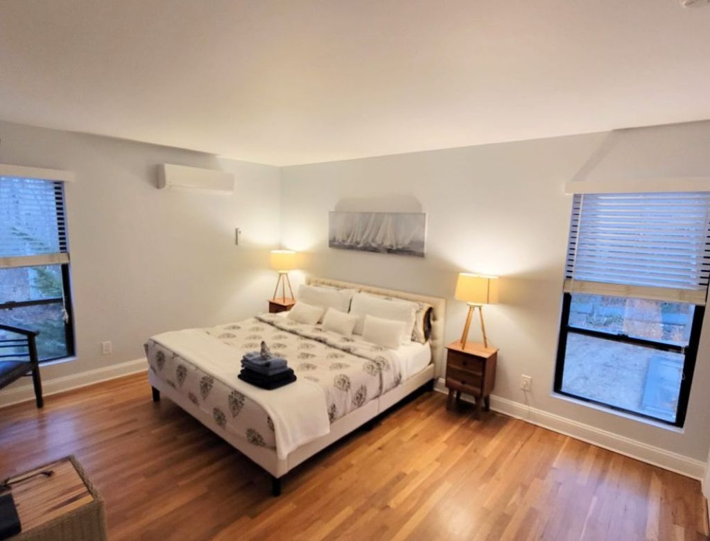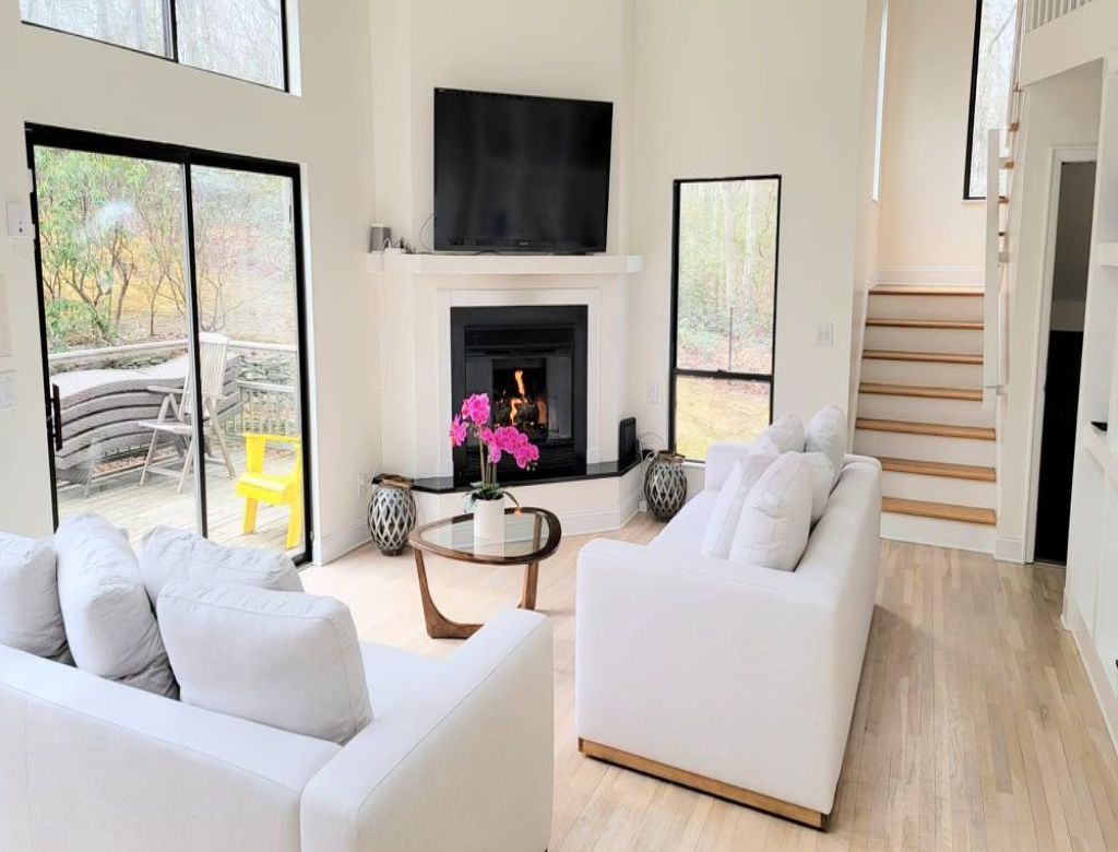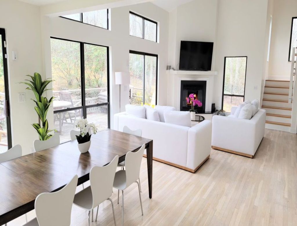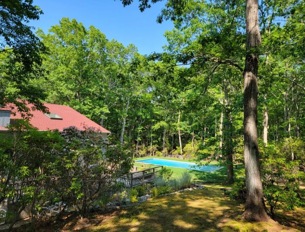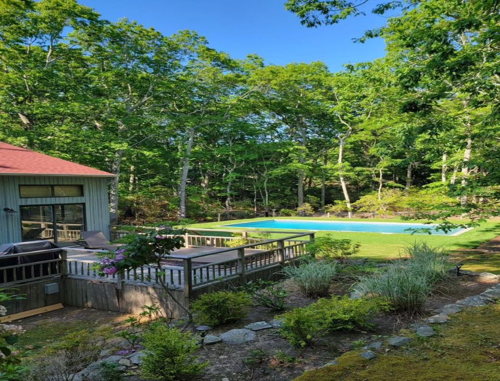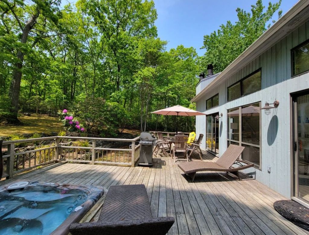 This inviting property features a spacious deck with a BBQ grill, a luxurious gunite pool (20x40) heated by an energy-efficient heat pump, and a soothing hot tub. Enjoy evenings by the firepit in the yard. Inside, discover three bedrooms, including two king-sized beds and one queen, with additional sleeping space on an open gallery with a queen-sized futon. The interior is bright and airy, boasting two sets of washer-dryers, a cozy propane fireplace, and pet-friendly accommodations (with protection for brand new sofas). Please note that the garage is not included in the rental agreement.