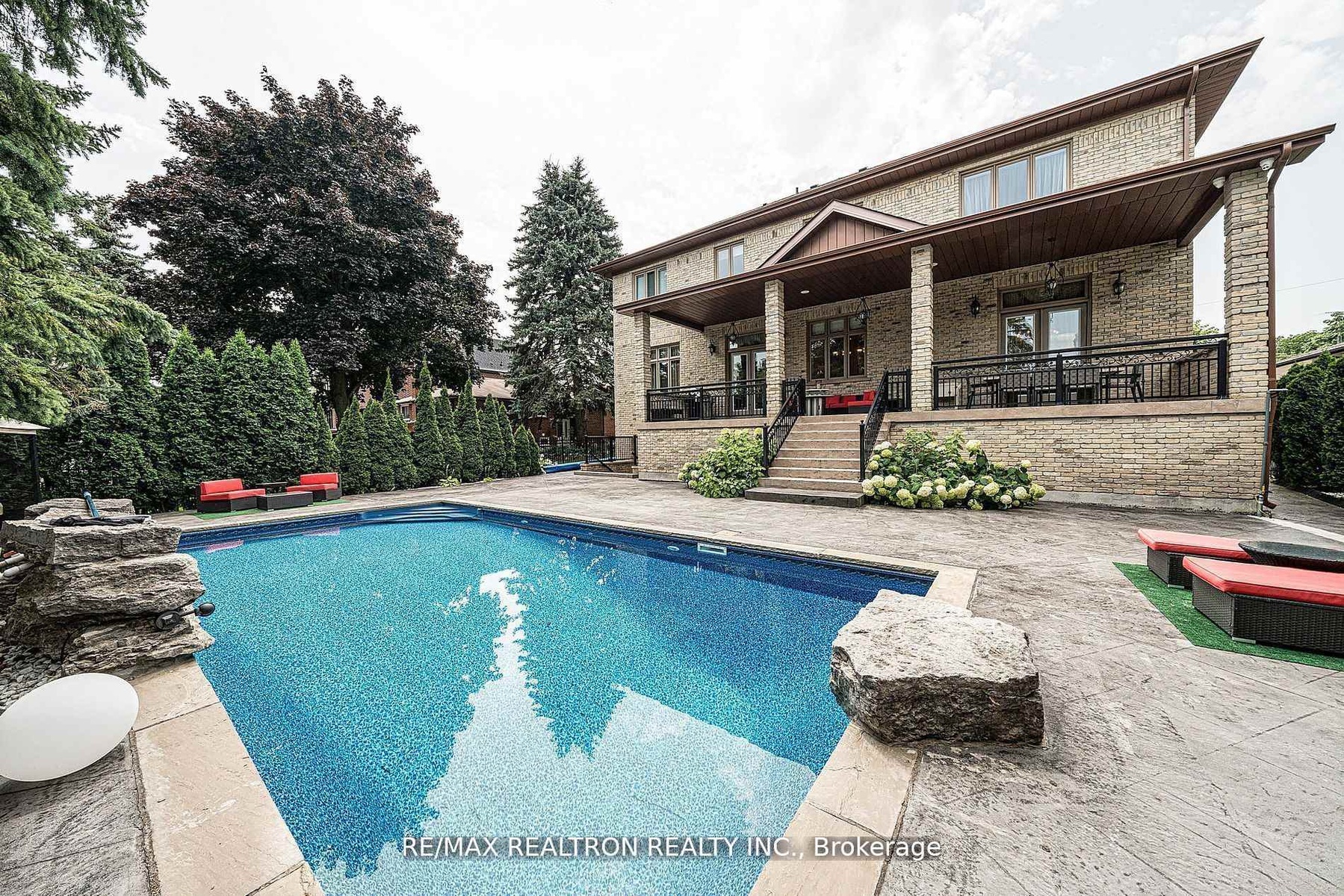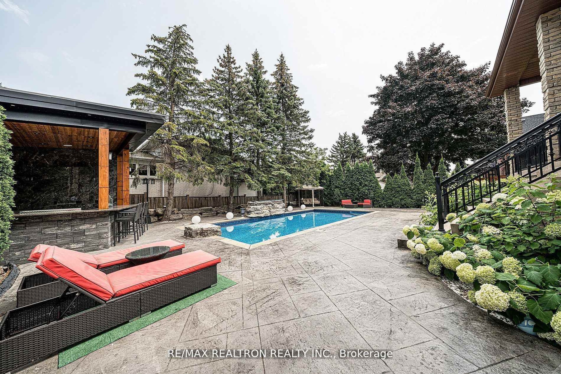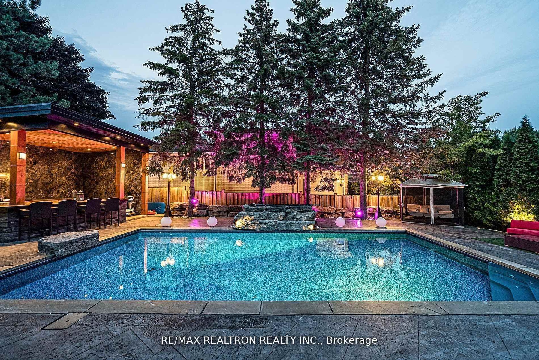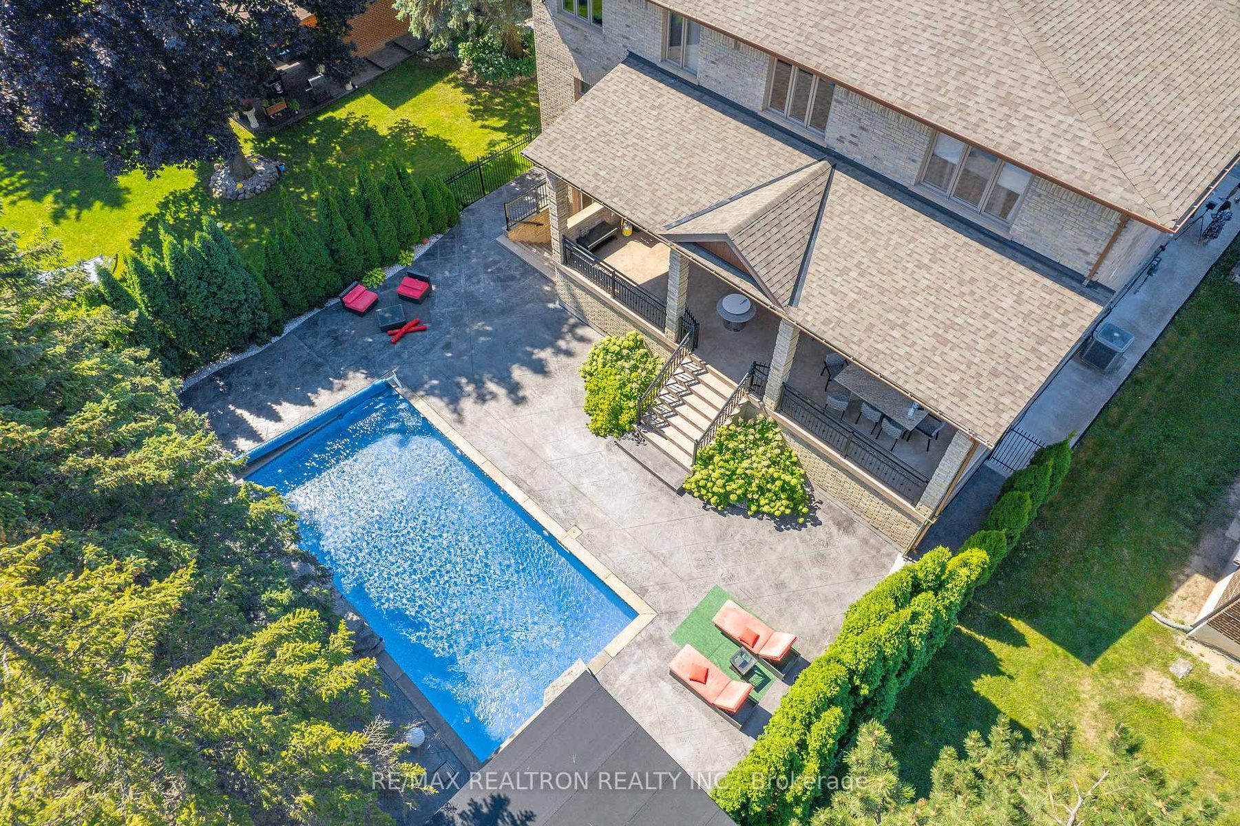 Experience luxury living in this stunning 5,500 sq. ft. custom-built residence, crafted with exceptional quality and attention to detail. The home showcases a beautifully designed kitchen featuring premium appliances. The main floor boasts soaring 12 ceilings, elegant designer lighting, custom drapery, and a combination of travertine and hardwood flooring. The spacious master suite offers a dressing area and two walk-in closets. A fully finished walk-up basement enhances the living space with a home theatre and wet bar. Charming cobblestone walkways and a driveway enhance the curb appeal, while the heated saltwater pool provides a resort-like atmosphere. Recent updates include a heated stamped concrete driveway, new vinyl and cover for the upgraded pool system, new roof shingles, and a stylish backyard cabana complete with BBQ, wet bar, wine cooler, cabinetry, and countertop. Additional highlights include an irrigation system, gated driveway, new countertops, basement bar sink, upgraded security with cameras, ceiling speakers, refinished hardwood floors, and a modernized powder room. The garage also features an electric vehicle charger, ideal for eco-conscious homeowners.