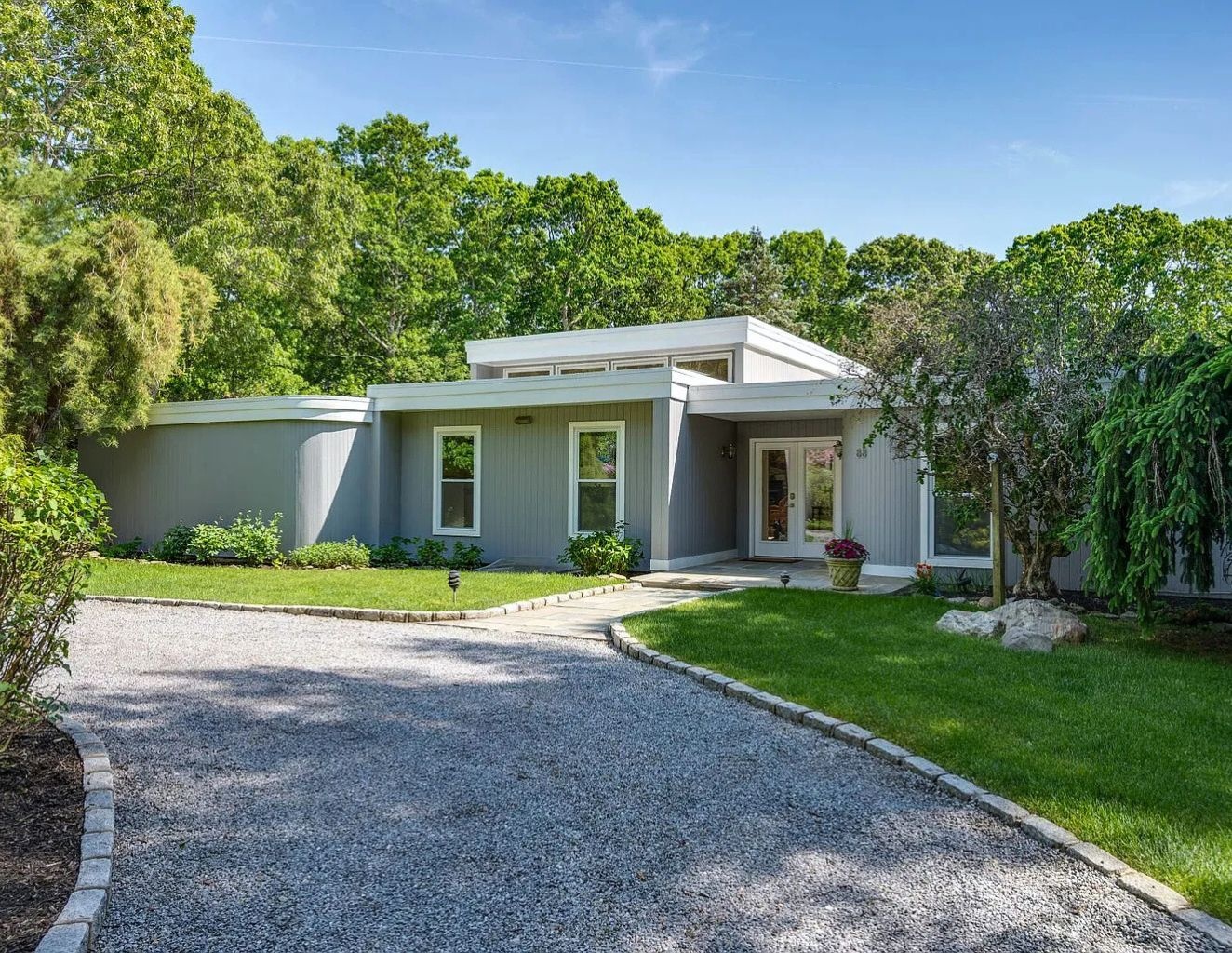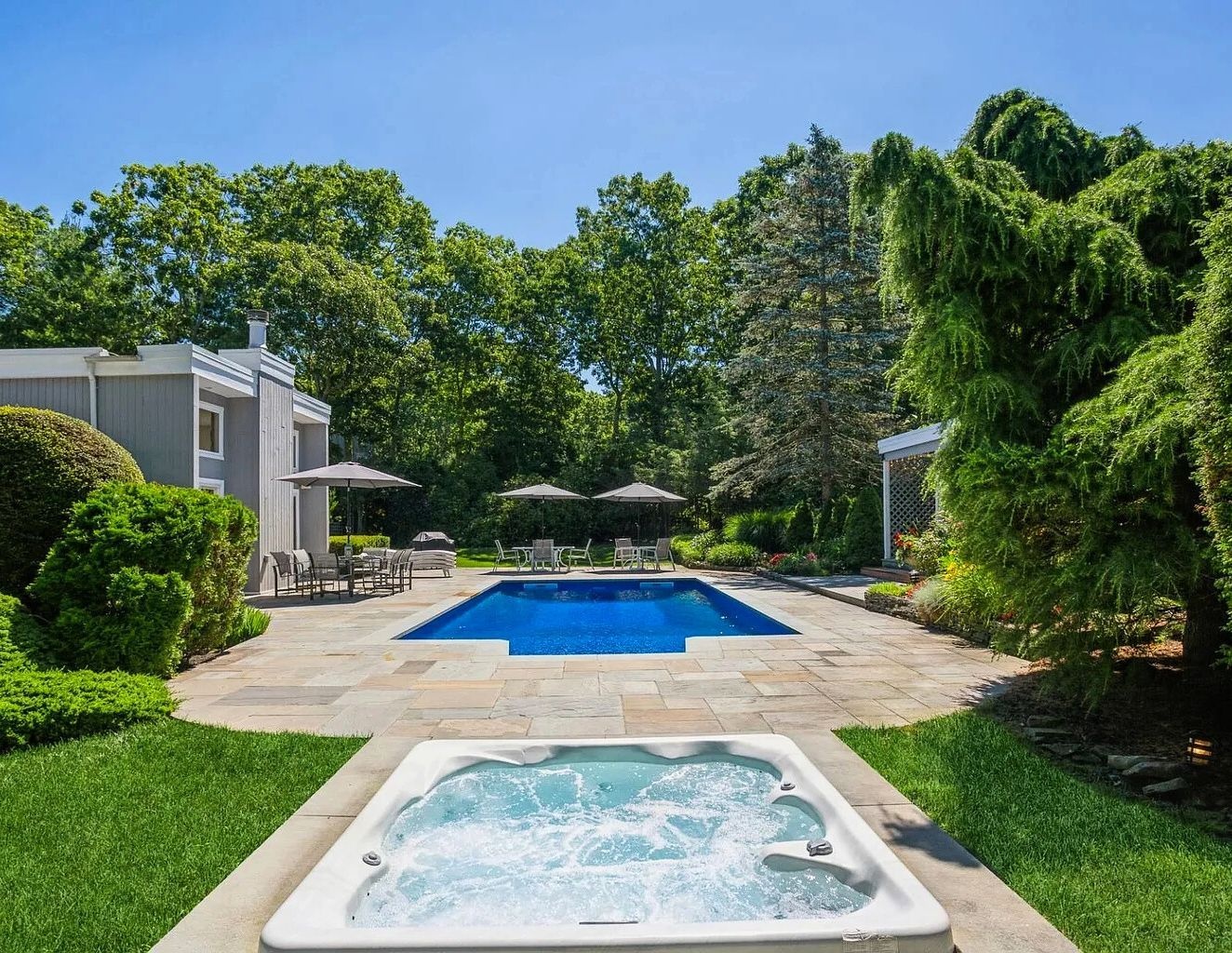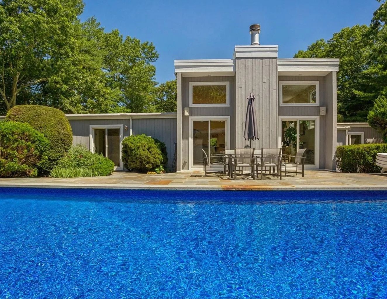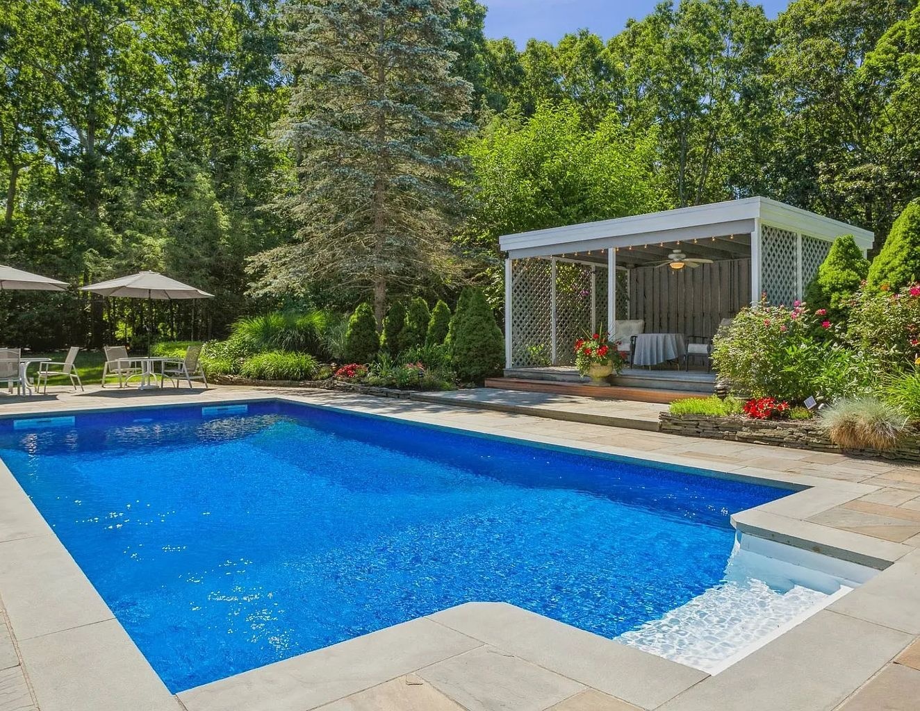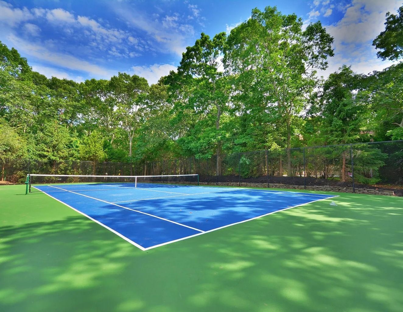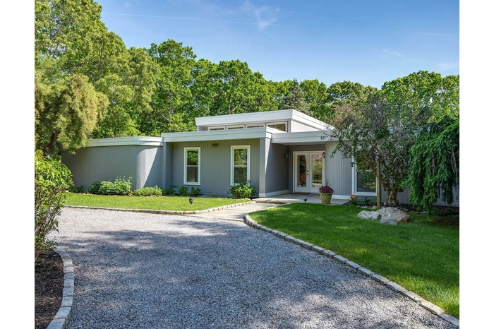 Relax in this private centrally located home. 5 bedrooms, 4.5 baths, 20x40 heated pool and new tennis court with beach rights to a nearby Peconic Bay beach.