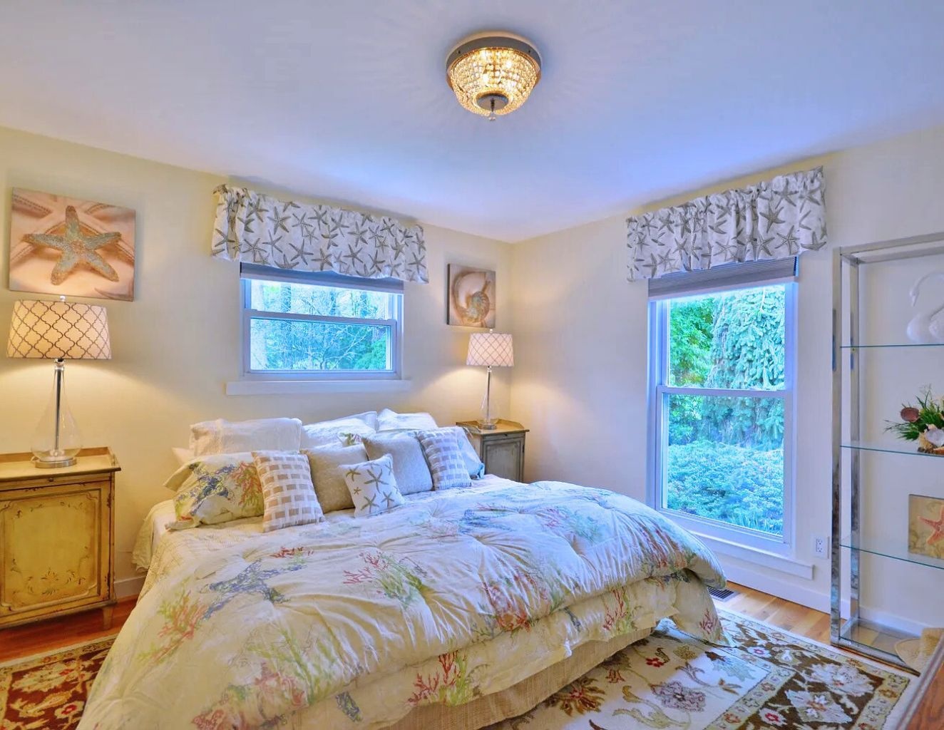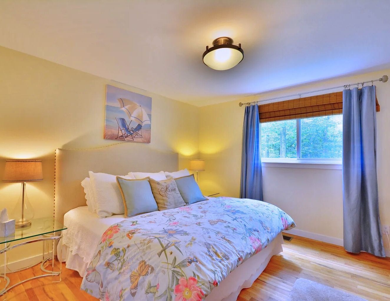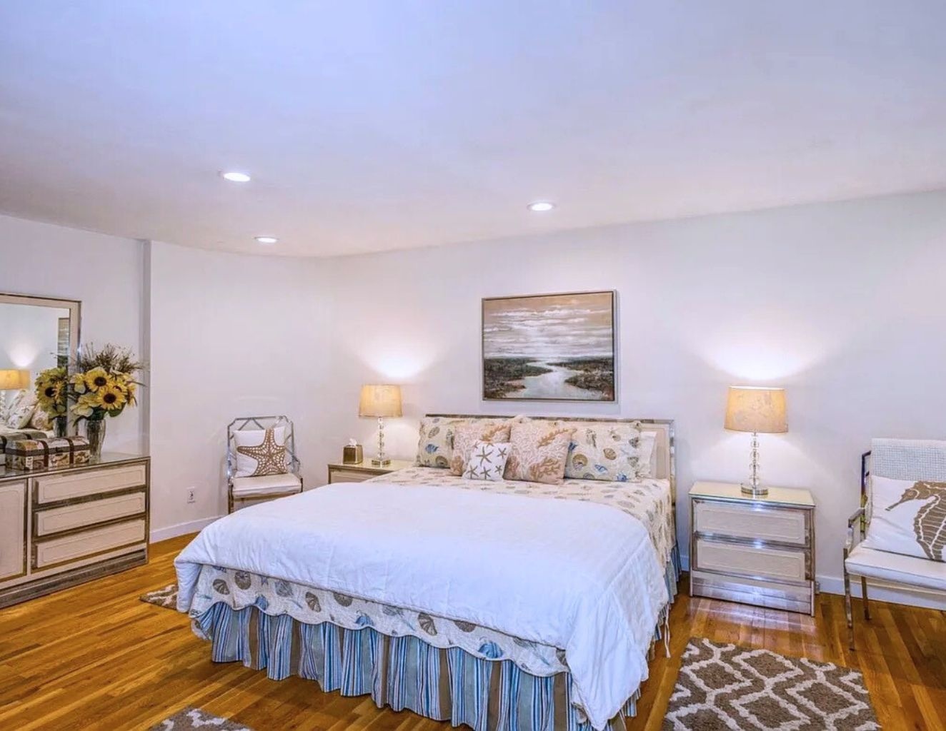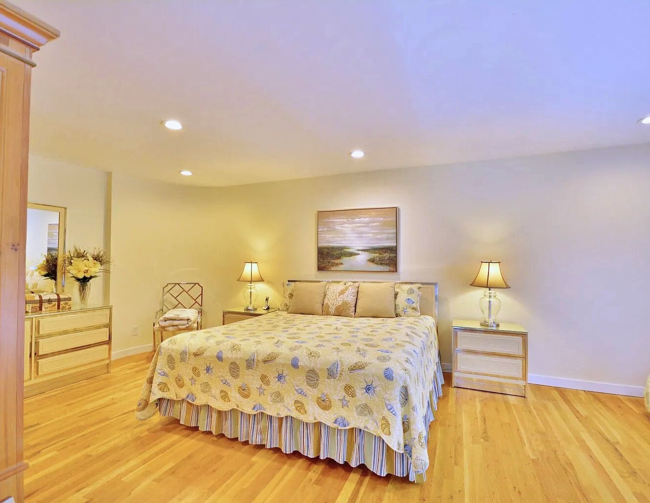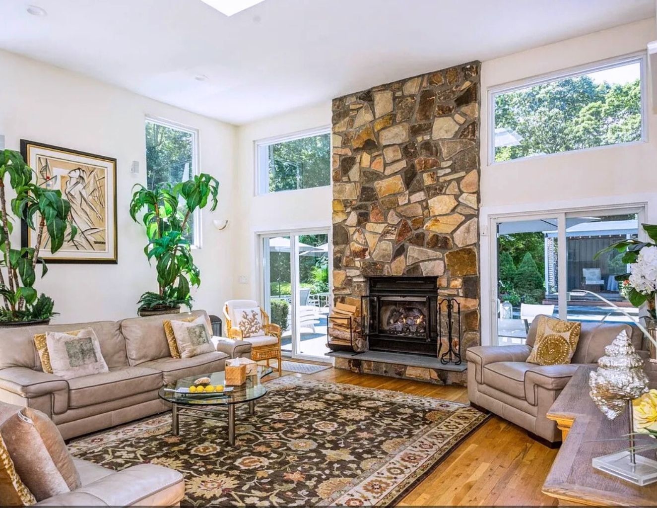 Relax in this private centrally located home. 5 bedrooms, 4.5 baths, 20x40 heated pool and new tennis court with beach rights to a nearby Peconic Bay beach.