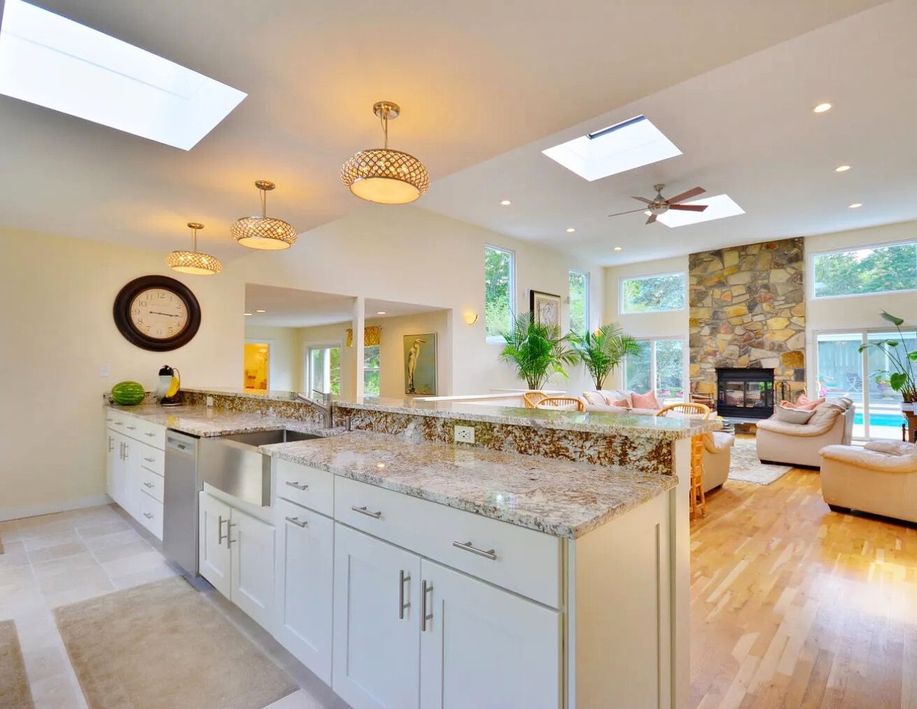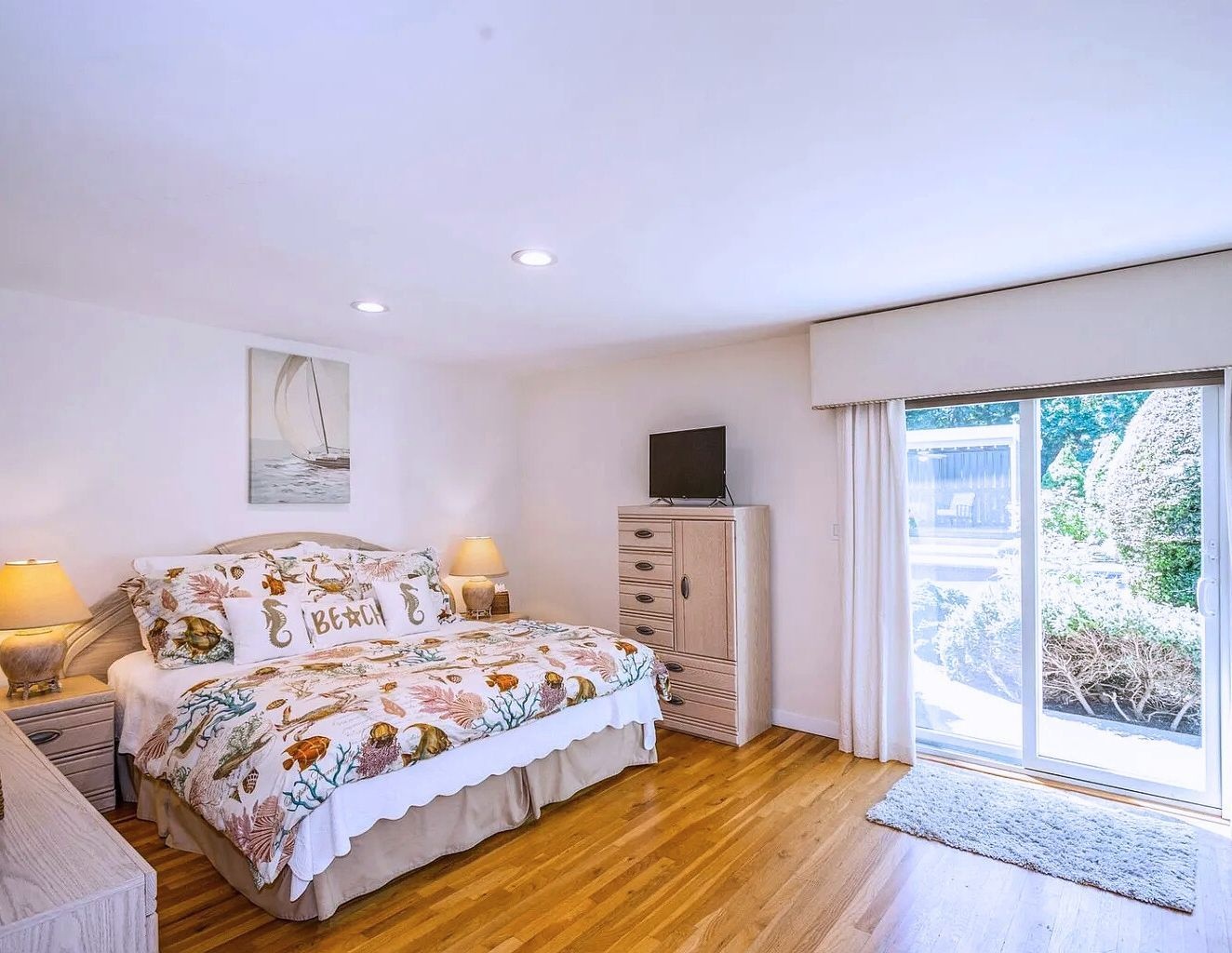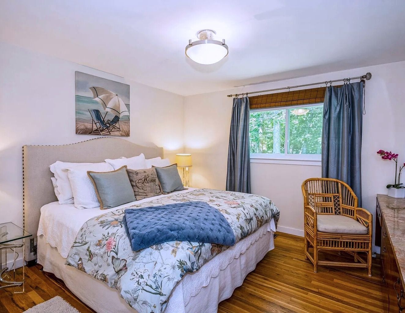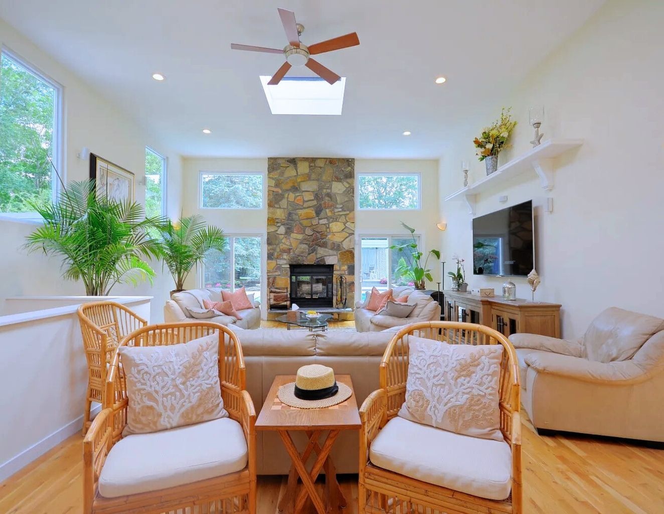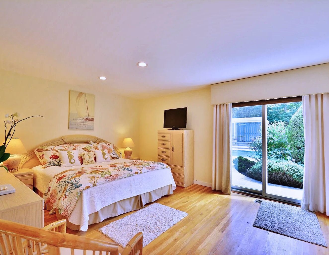 Relax in this private centrally located home. 5 bedrooms, 4.5 baths, 20x40 heated pool and new tennis court with beach rights to a nearby Peconic Bay beach.