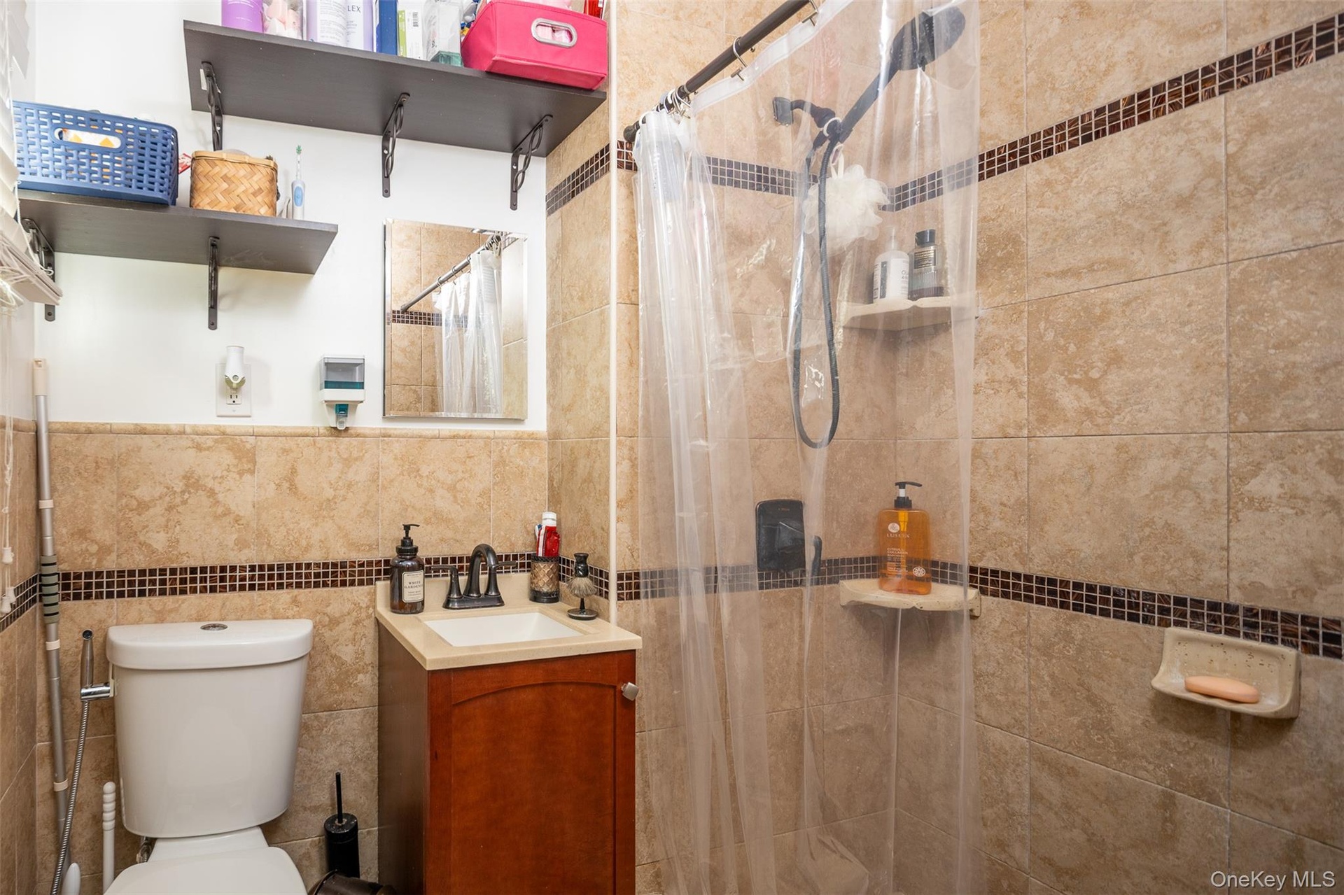 - Bathroom featuring tile walls, vanity, and a shower with curtain