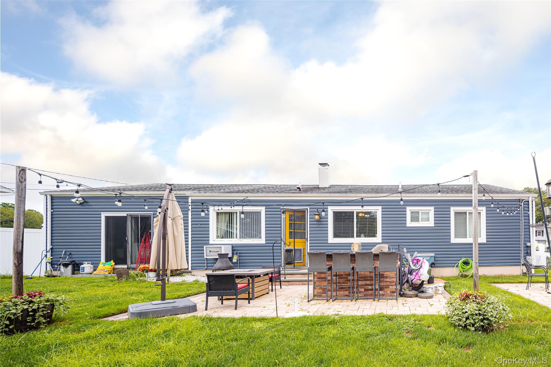 - Rear view of house featuring a patio area, a shingled roof, and a chimney