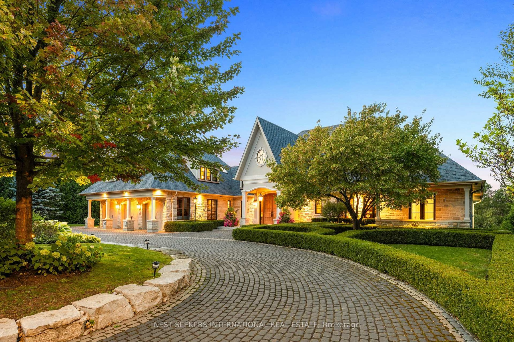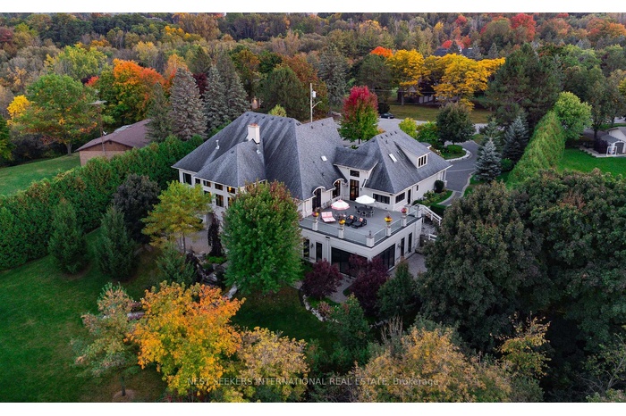 Nestled in the coveted Kingscross Estates! This extraordinary 6-bedroom, 11,300 sq ft French Country estate bungalow is situated on 2.6 acres in a quiet cul-de-sac, offering unparalleled privacy and exclusivity. Surrounded by lush perennial gardens and the breathtaking Oak Ridges Moraine, this home is a true masterpiece. Walking distance to King City Trails, providing hours of scenic walking and hiking through nature. Exquisite millwork, intricate wainscoting, and artisanal craftsmanship elevate every space in this home. Hand-carved detailing, custom coffered ceilings, and elegant paneling exude timeless sophistication. No expense has been spared in designing this remarkable estate, offering a seamless blend of old-world charm and modern refinement. A grand double driveway and entrance welcome you into this exceptional residence, with interlock throughout, enhancing the luxurious curb appeal. The landscaping is absolutely stunning, with meticulously designed front and back gardens, mature trees, stone pathways, and curated outdoor spaces. An entertainers paradise, featuring soaring volume ceilings, a gourmet chefs kitchen with a built-in custom pantry, an adjoining built-in bar, and an impressive 1,500 sq ft raised walkout terrace overlooking the most spectacular conservation views. The primary suite is a sanctuary of comfort and elegance, featuring a two-sided fireplace and garden doors opening to the backyard gardens, blending indoor and outdoor living seamlessly. The additional 2-bedroom loft includes a separate family room and bath, perfect for guests or extended family. The completely finished lower level is a showstopper, boasting a stunning indoor pool, infrared and wet saunas, a steam shower, a gym, a separate washer/dryer, and several walkouts to a covered lanai with a fireplace. Designed for wellness, relaxation, and year-round enjoyment, this space offers ultimate comfort.