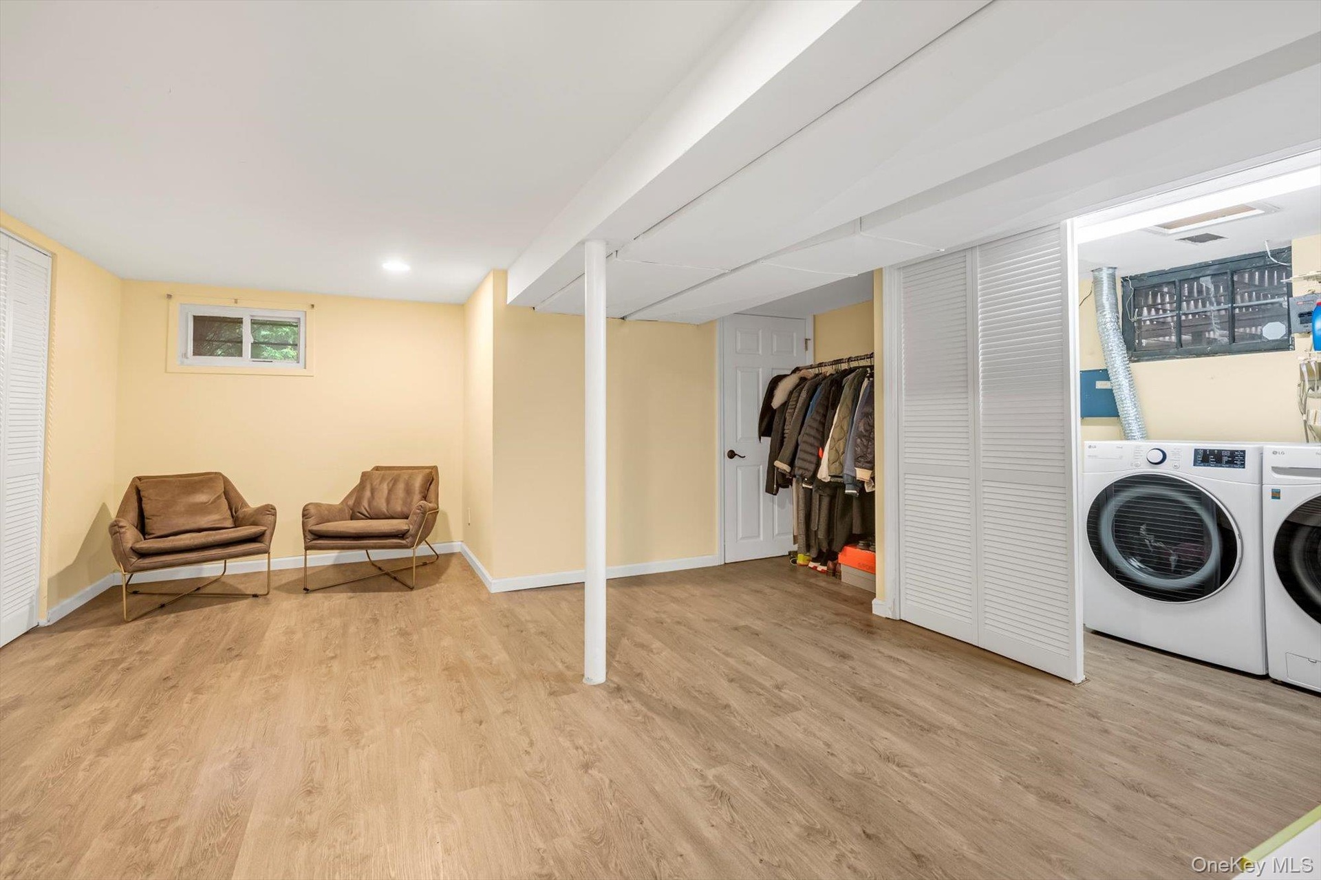 - Washroom featuring light wood-style flooring, washer and dryer, and recessed lighting