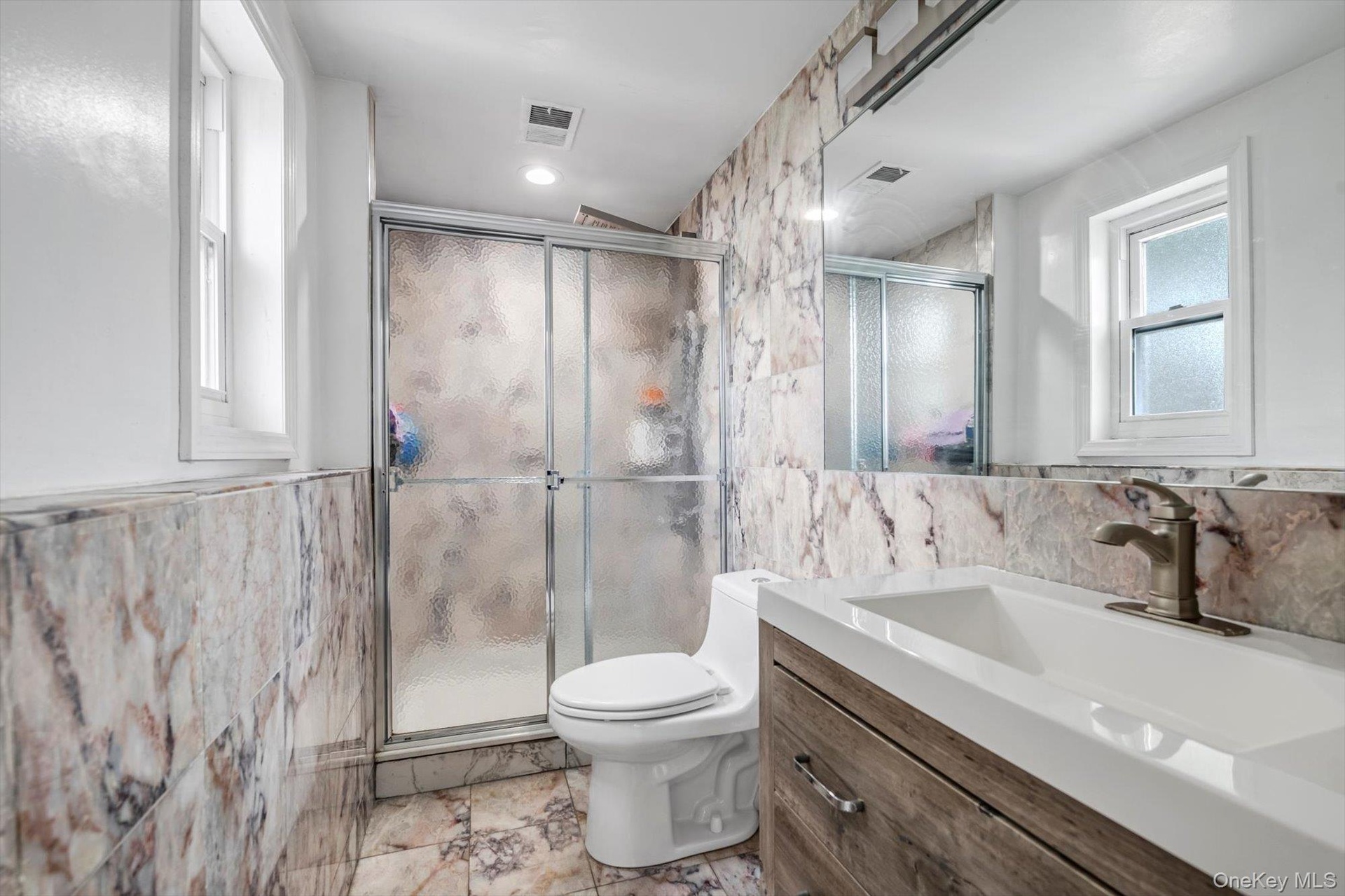 - Full bathroom featuring tile walls, vanity, and a shower stall