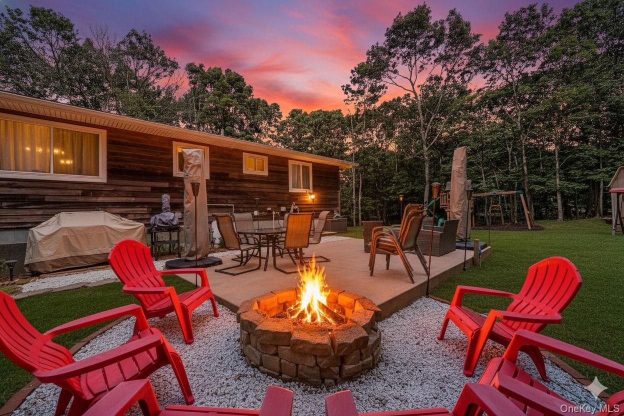 - Patio terrace at dusk featuring a patio area, a playground, a grill, a lawn, and outdoor dining area