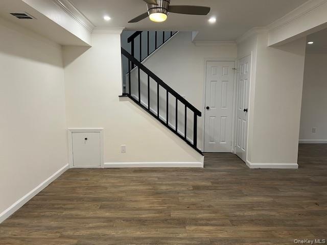 - Basement with crown molding, stairs, recessed lighting, dark wood finished floors, and a ceiling fan