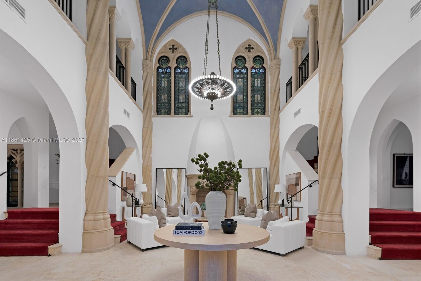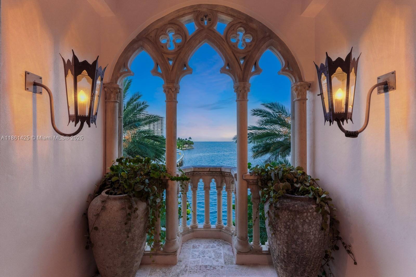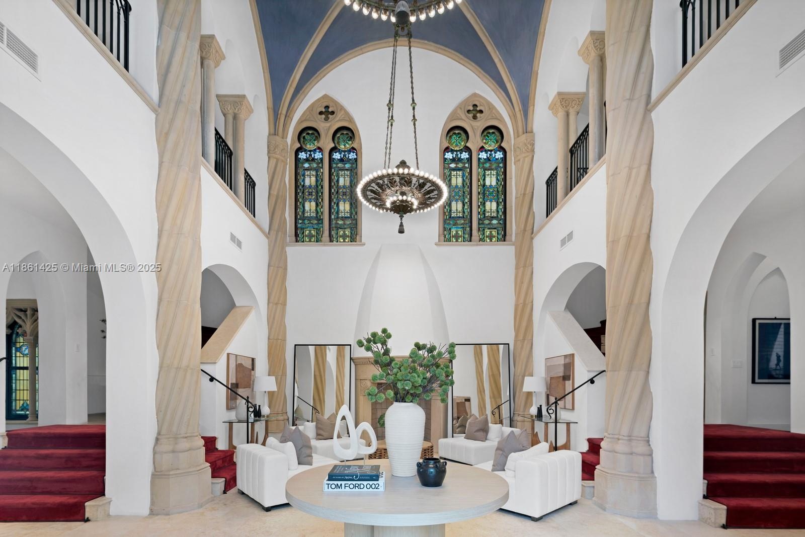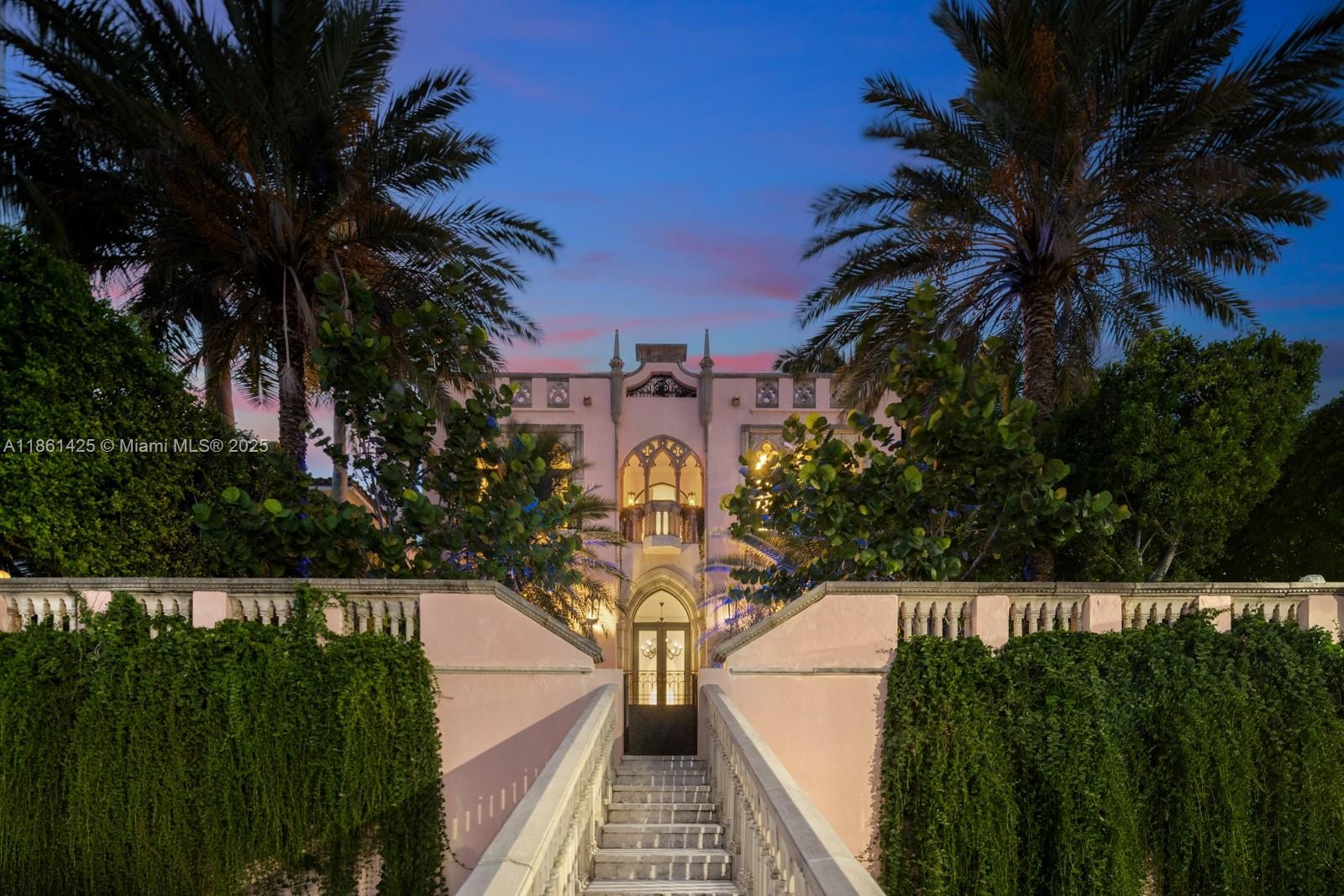 A fairytale castle in Coconut Grove, designed by Ralph Portuondo, where Gothic grandeur meets modern sophistication. The dramatic Great Hall boasts 30-ft vaulted ceilings, stone fireplaces & antique stained-glass, complemented by French cast bronze chandeliers and Jerusalem stone floors. Highlights include a La Cornue chef’s kitchen, elevator, keystone-edged infinity pool, cement dock, rooftop sundeck & terraces with water views. Landscaping by Fernando Wong, Murano chandeliers by B.F. Signoretti, and custom metalwork fencing by Belt Designs add bespoke elegance. Plus, independent living quarters with kitchen & a 3,000 sq/ft unfinished basement complete this one-of-a-kind estate.