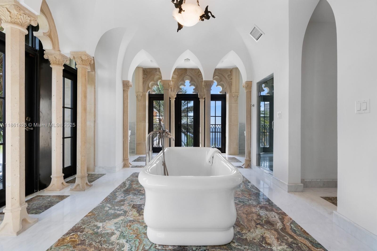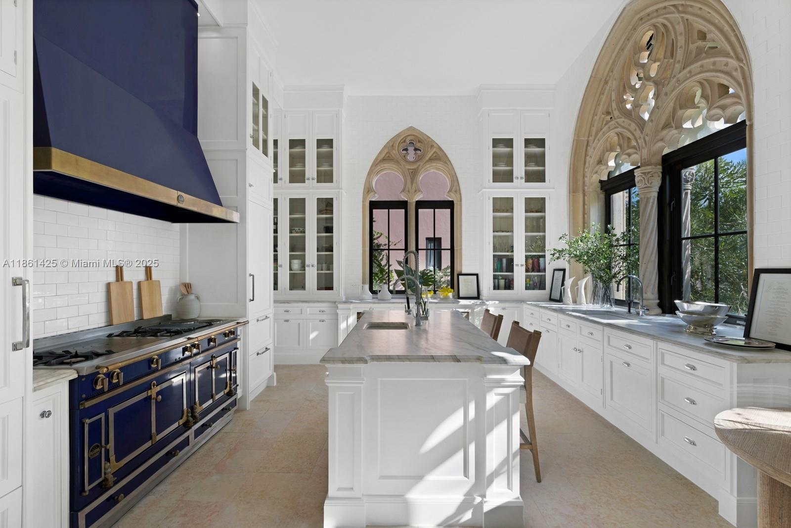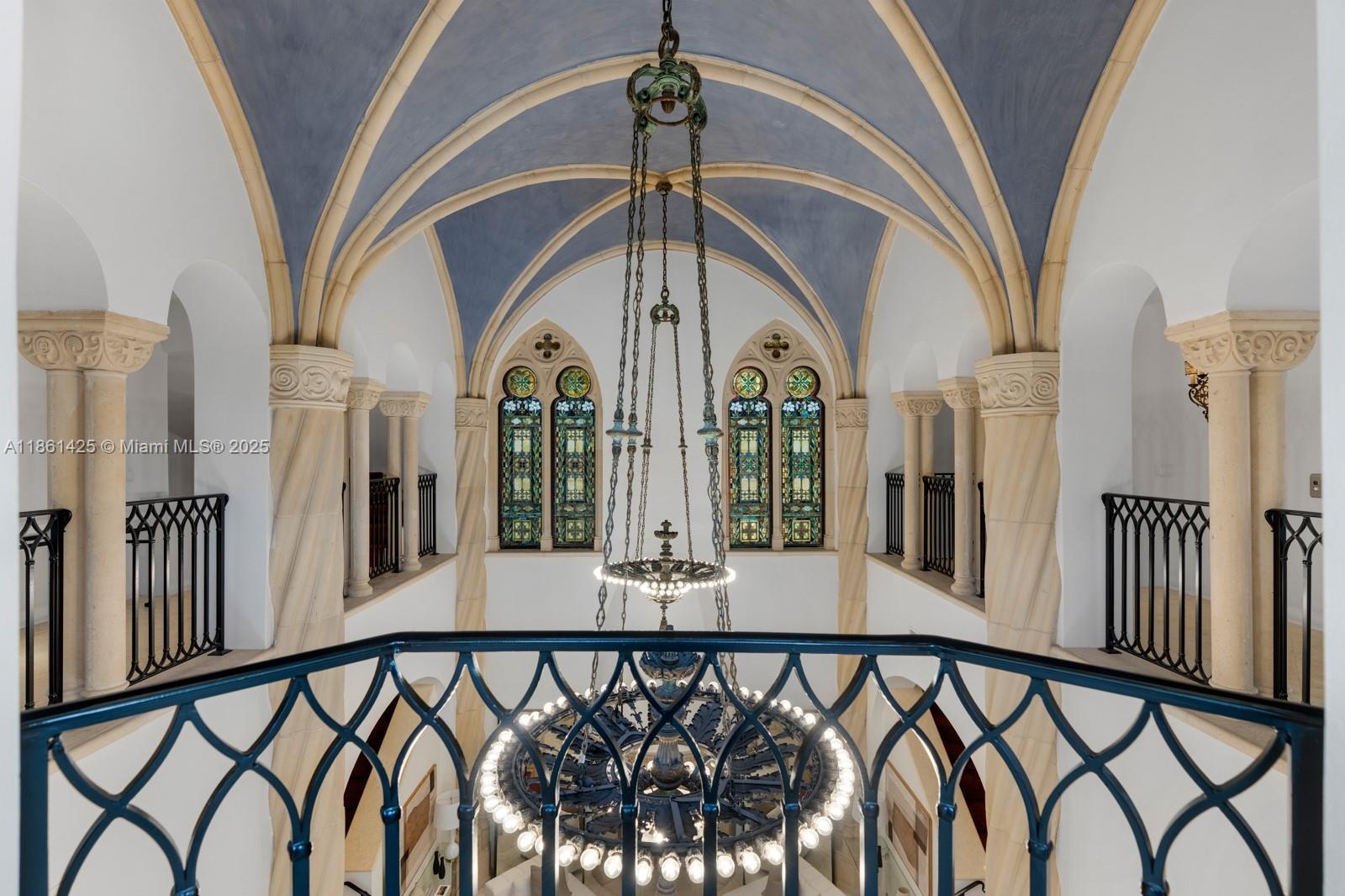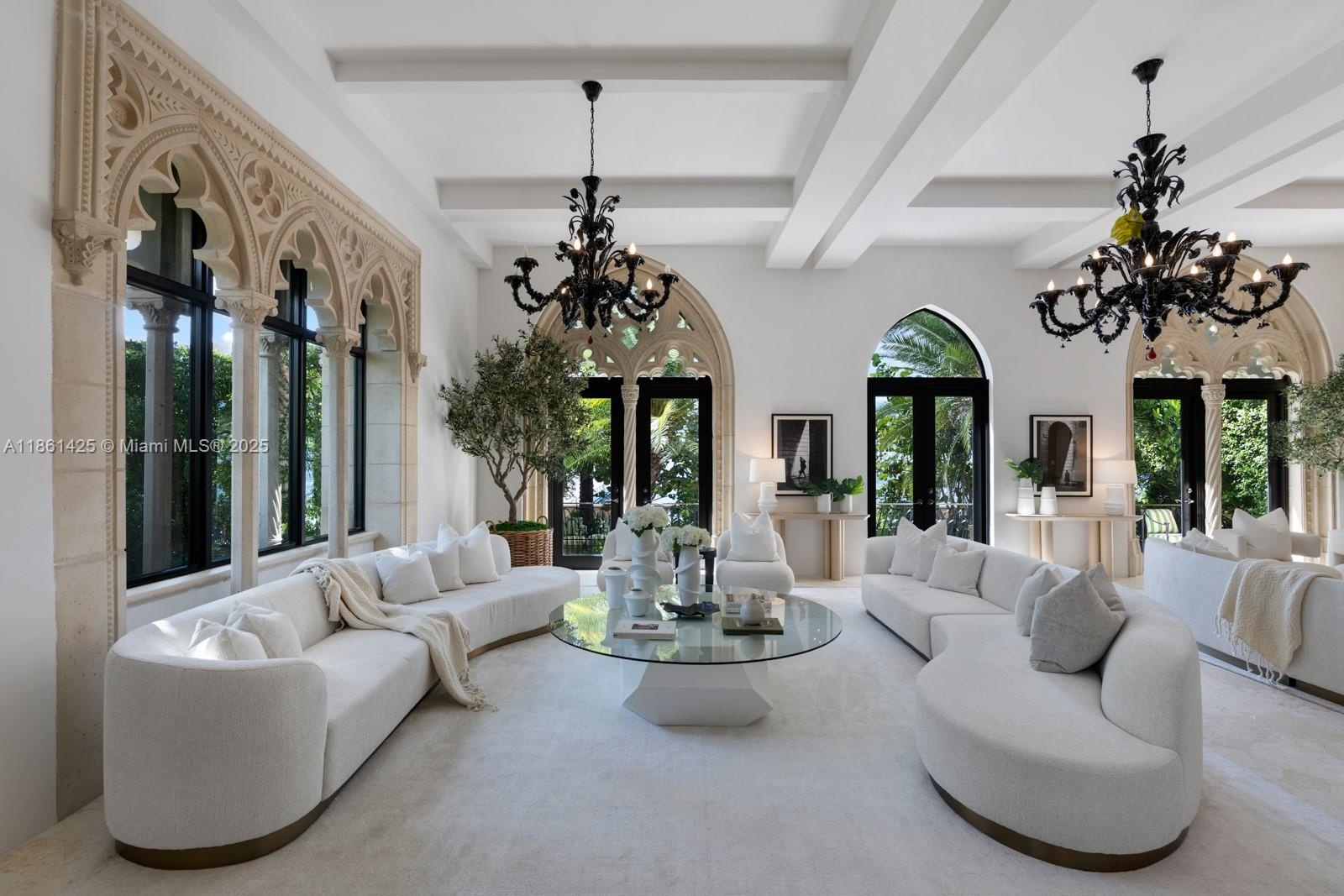 A fairytale castle in Coconut Grove, designed by Ralph Portuondo, where Gothic grandeur meets modern sophistication. The dramatic Great Hall boasts 30-ft vaulted ceilings, stone fireplaces & antique stained-glass, complemented by French cast bronze chandeliers and Jerusalem stone floors. Highlights include a La Cornue chef’s kitchen, elevator, keystone-edged infinity pool, cement dock, rooftop sundeck & terraces with water views. Landscaping by Fernando Wong, Murano chandeliers by B.F. Signoretti, and custom metalwork fencing by Belt Designs add bespoke elegance. Plus, independent living quarters with kitchen & a 3,000 sq/ft unfinished basement complete this one-of-a-kind estate.