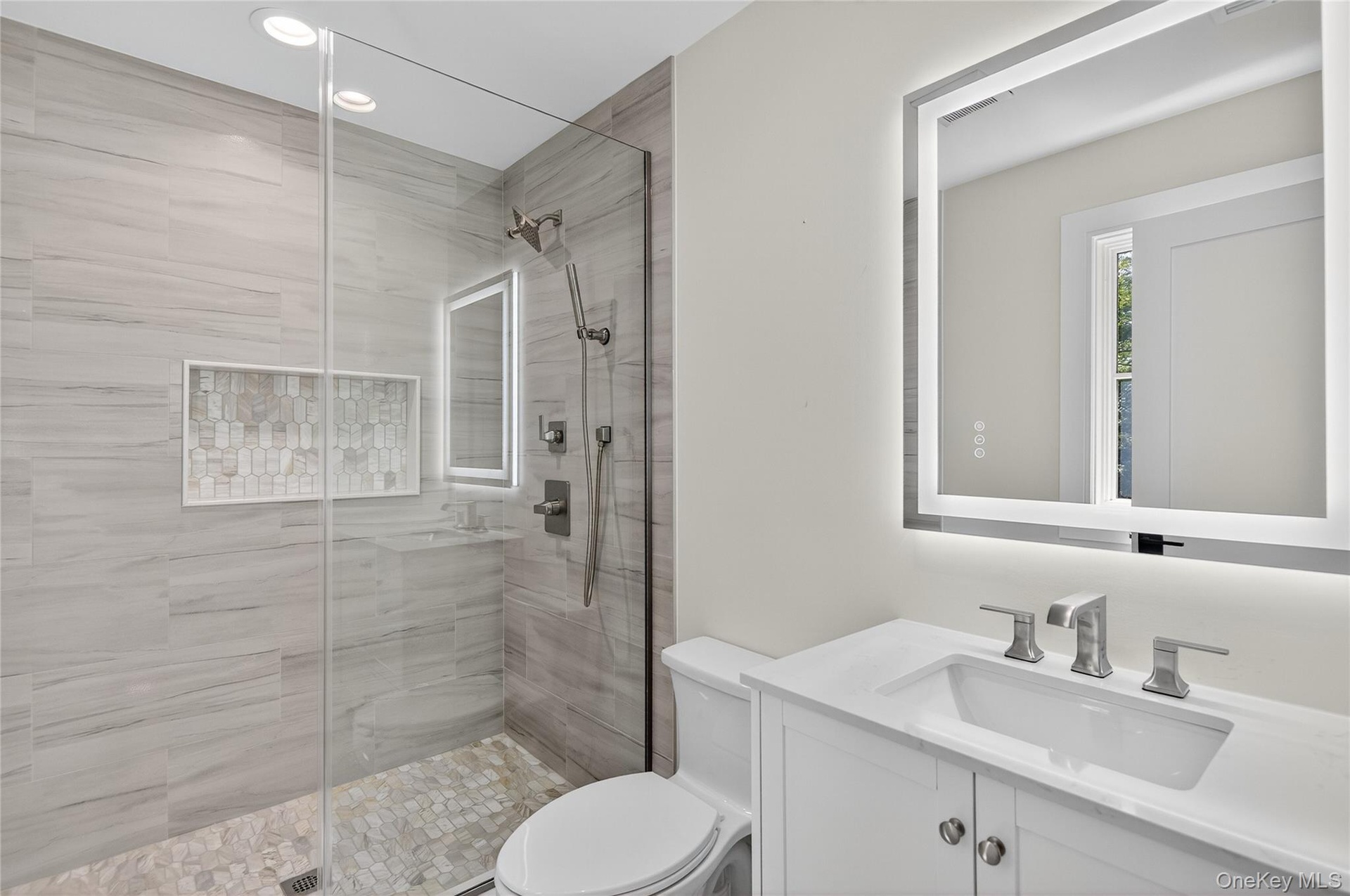 - Bathroom with vanity, a walk in shower, and recessed lighting