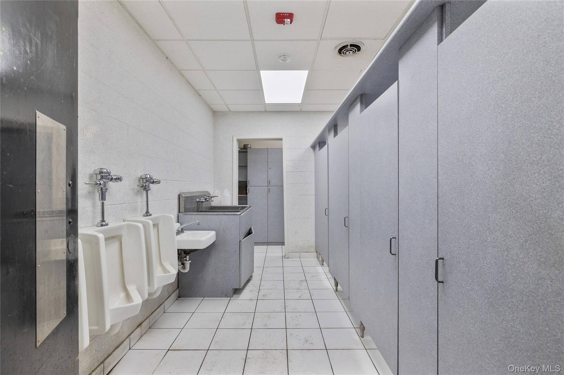 - Full bath with tile patterned floors, a drop ceiling, and a bathtub