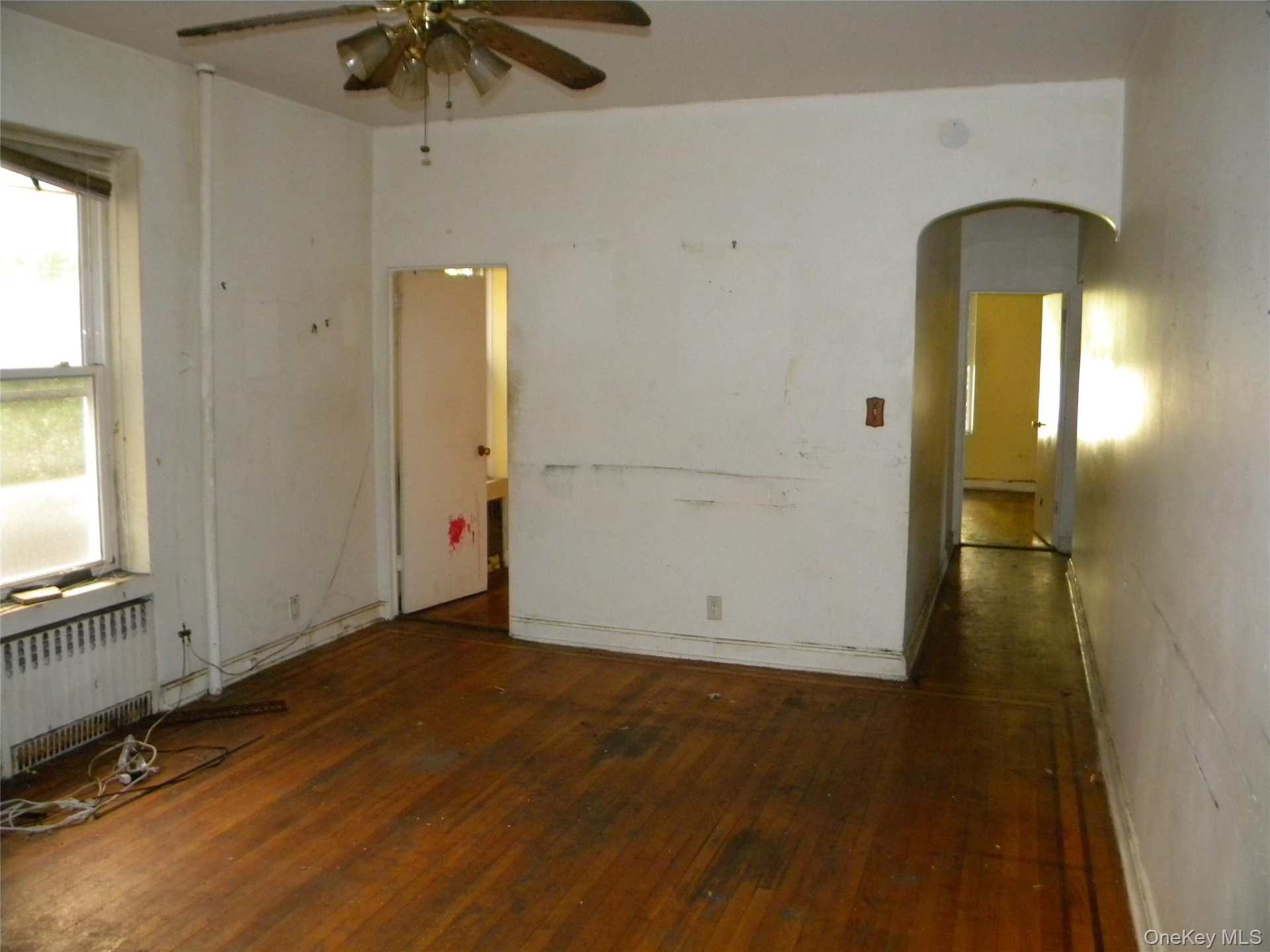 - Unfurnished room with dark wood finished floors, radiator heating unit, arched walkways, and ceiling fan