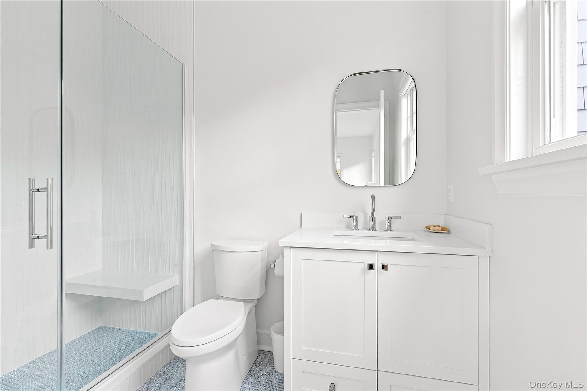 - Full bath featuring vanity, a stall shower, and tile patterned flooring