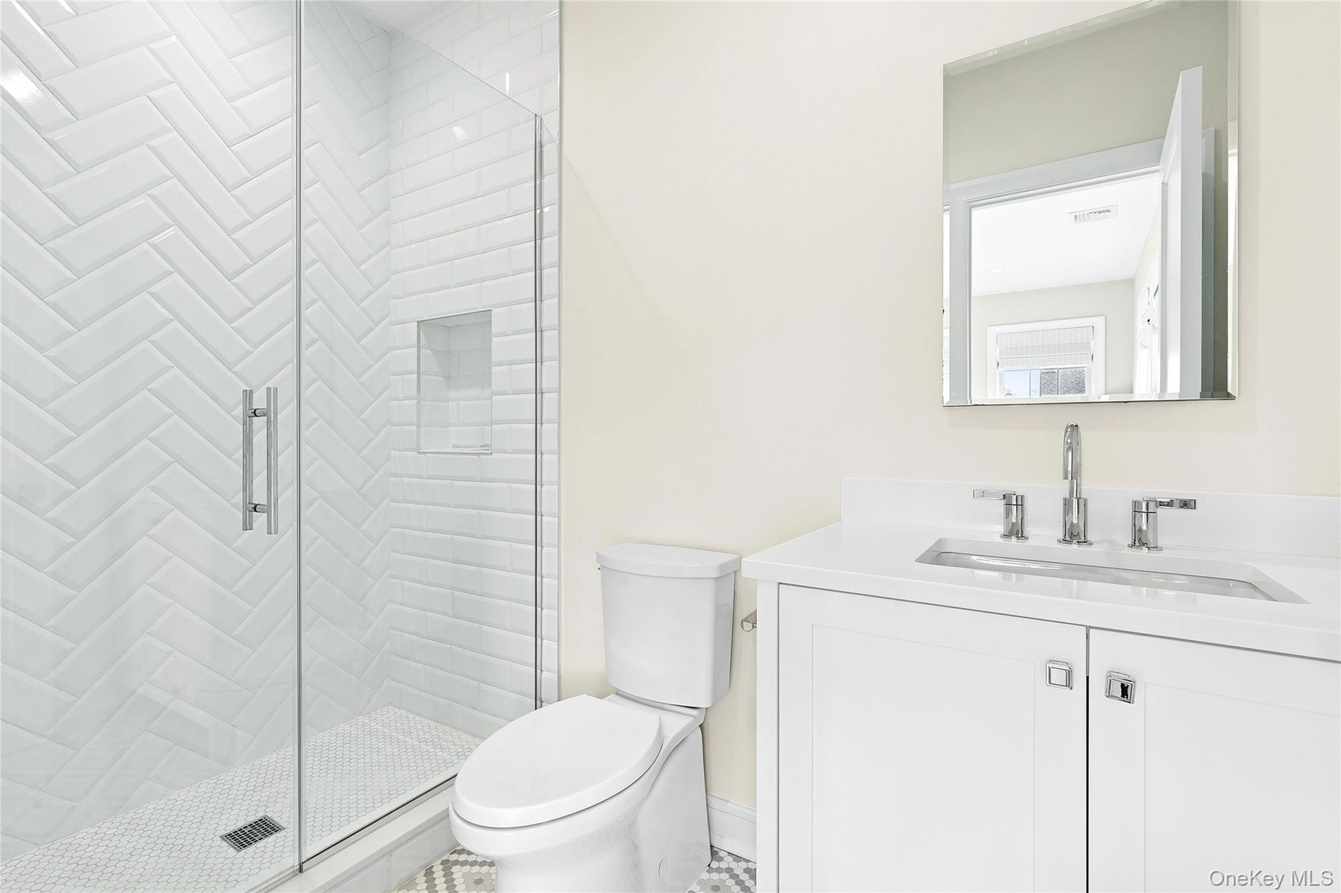 - Full bath with vanity, a stall shower, and tile patterned flooring