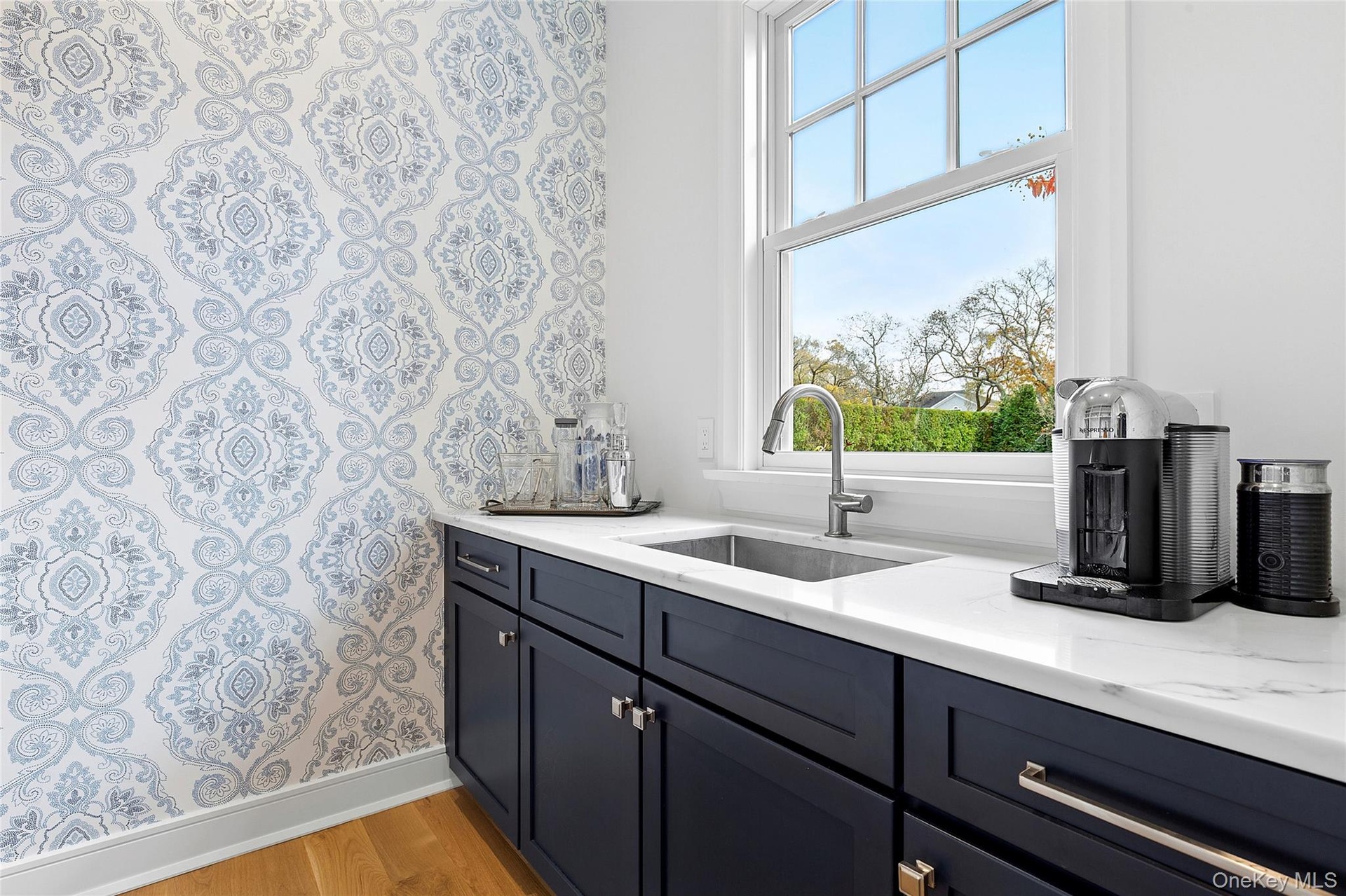 - Bar area with light wood-style flooring, light stone countertops, and blue cabinetry
