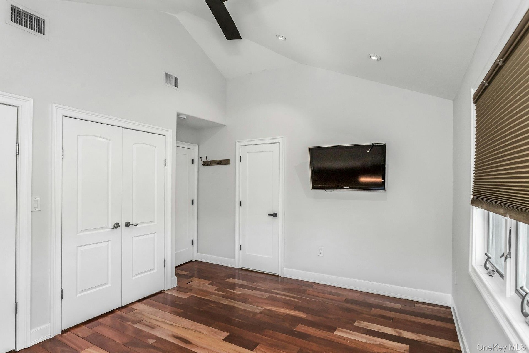 - Unfurnished bedroom with dark wood finished floors and high vaulted ceiling