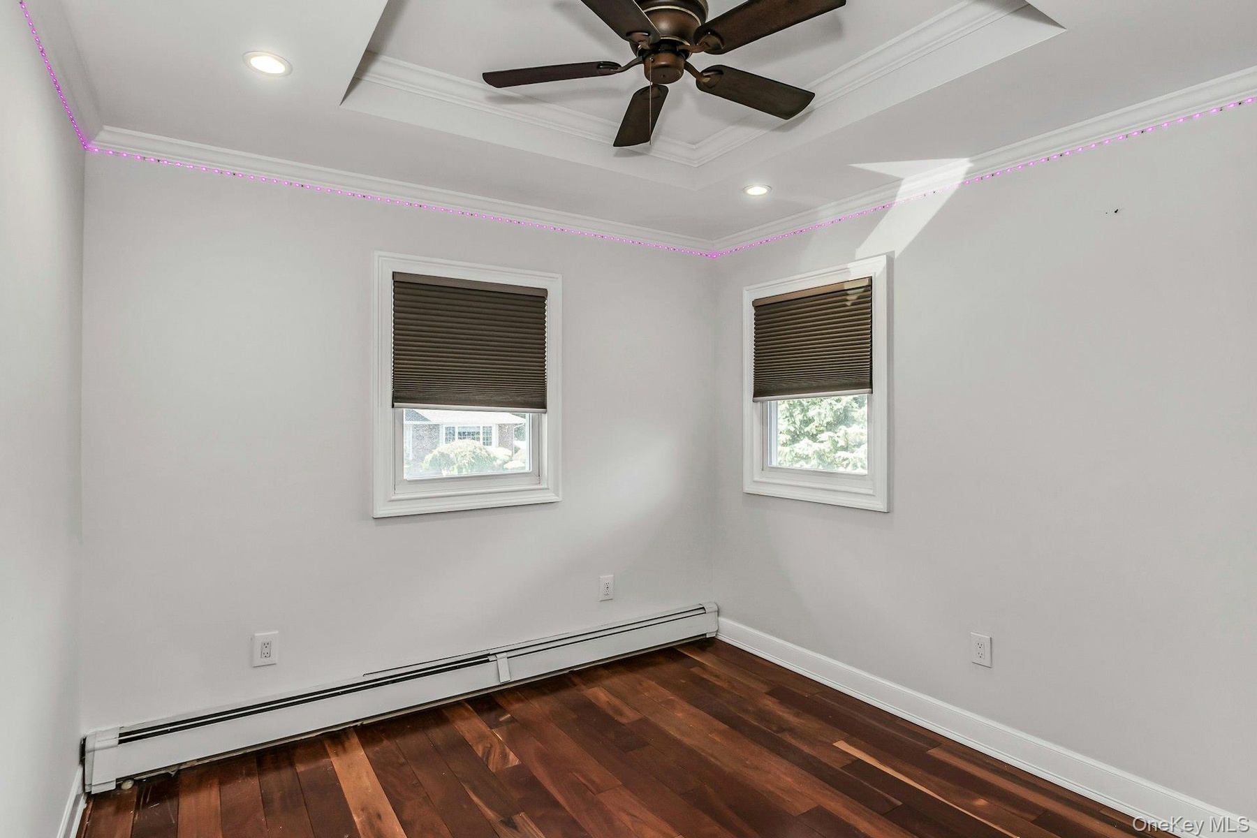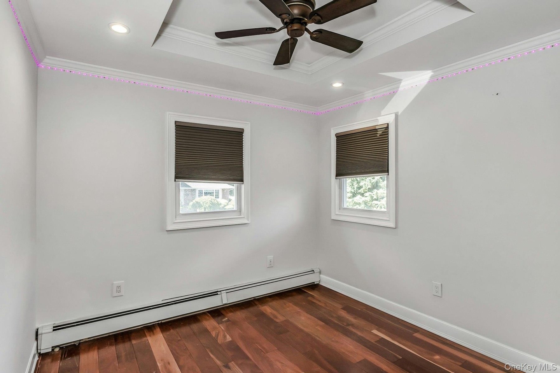 - Empty room featuring baseboard heating, plenty of natural light, a tray ceiling, dark wood finished floors, and crown molding