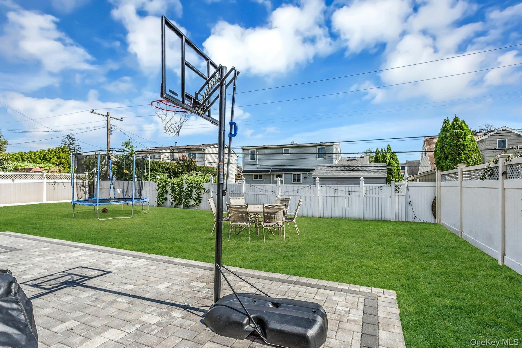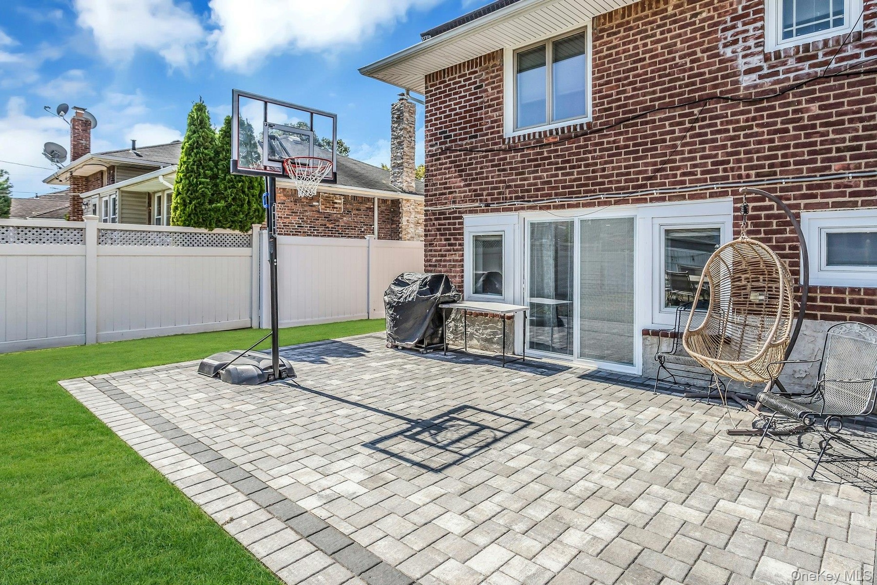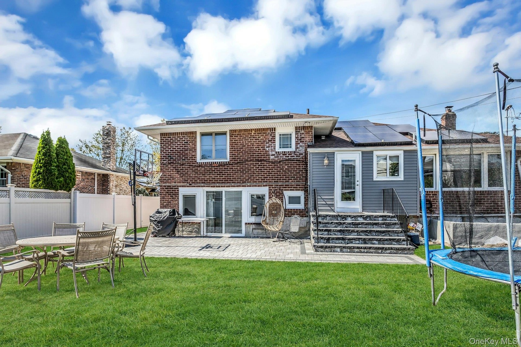 - Back of property with a patio, solar panels, a trampoline, and brick siding
