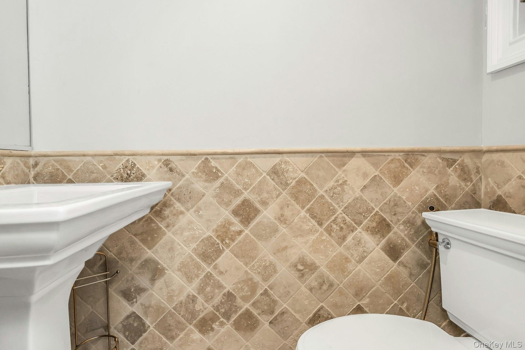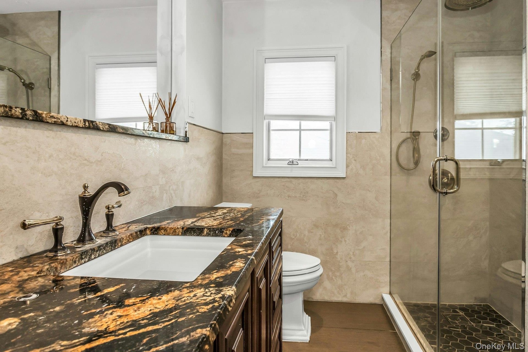 - Bathroom featuring tile walls, a stall shower, vanity, and a wainscoted wall