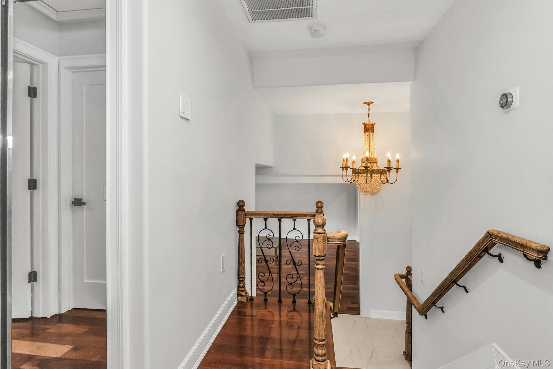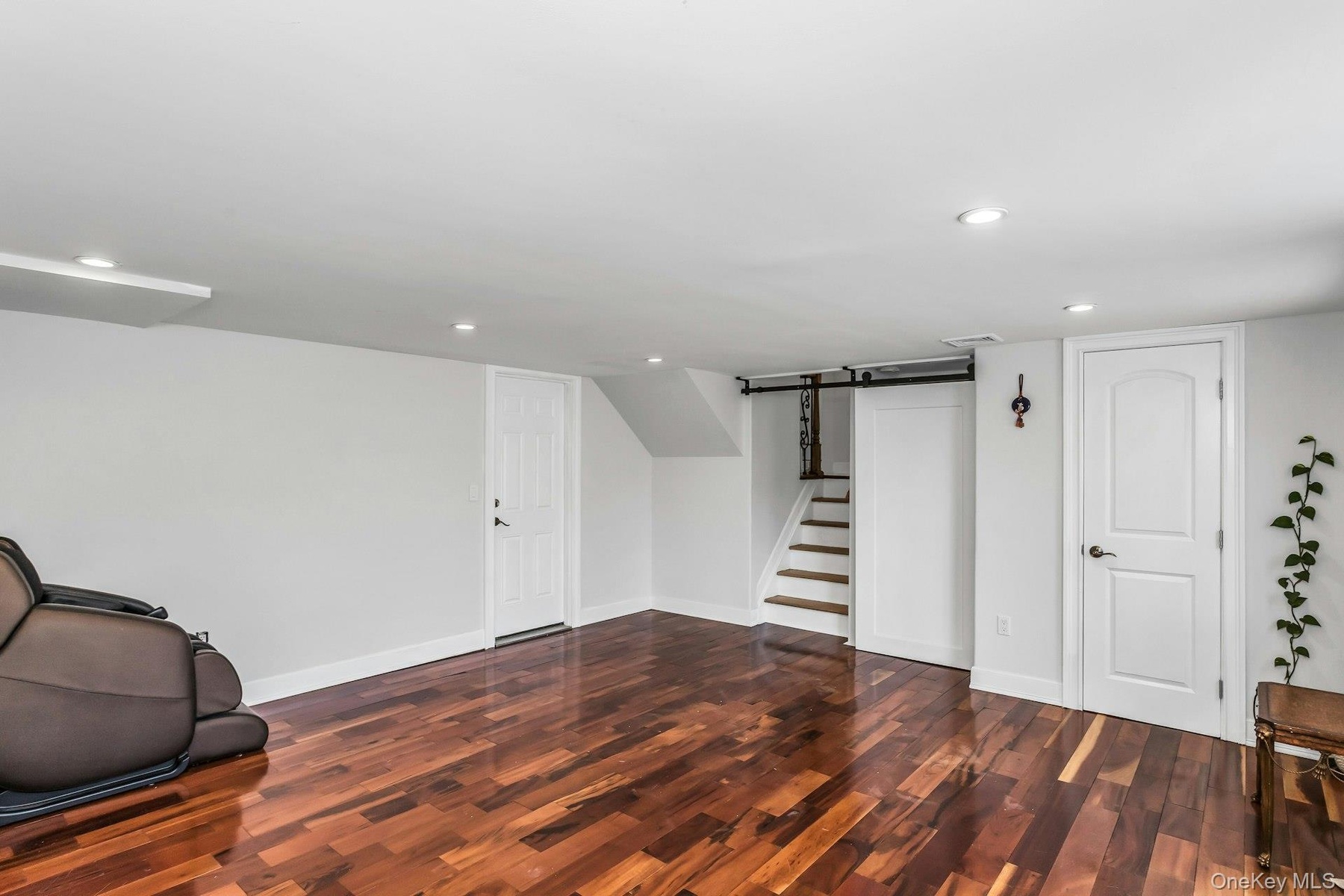 - Finished below grade area with recessed lighting, stairs, and dark wood-type flooring