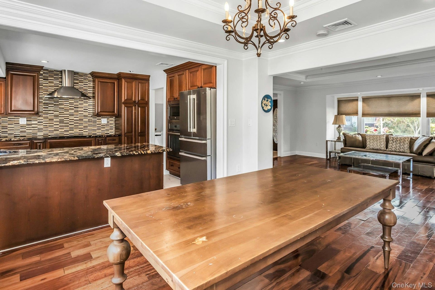 - Kitchen with hanging light fixtures, dark stone counters, ornamental molding, backsplash, and wall chimney range hood