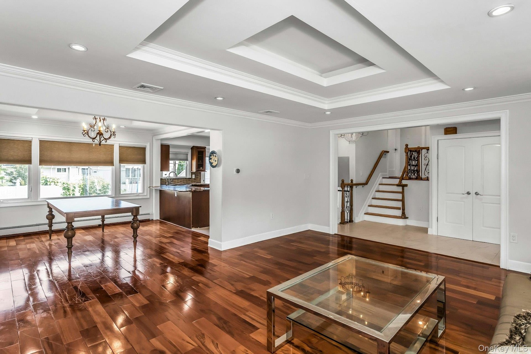 - Living area with a tray ceiling, crown molding, dark wood-style floors, recessed lighting, and a baseboard radiator