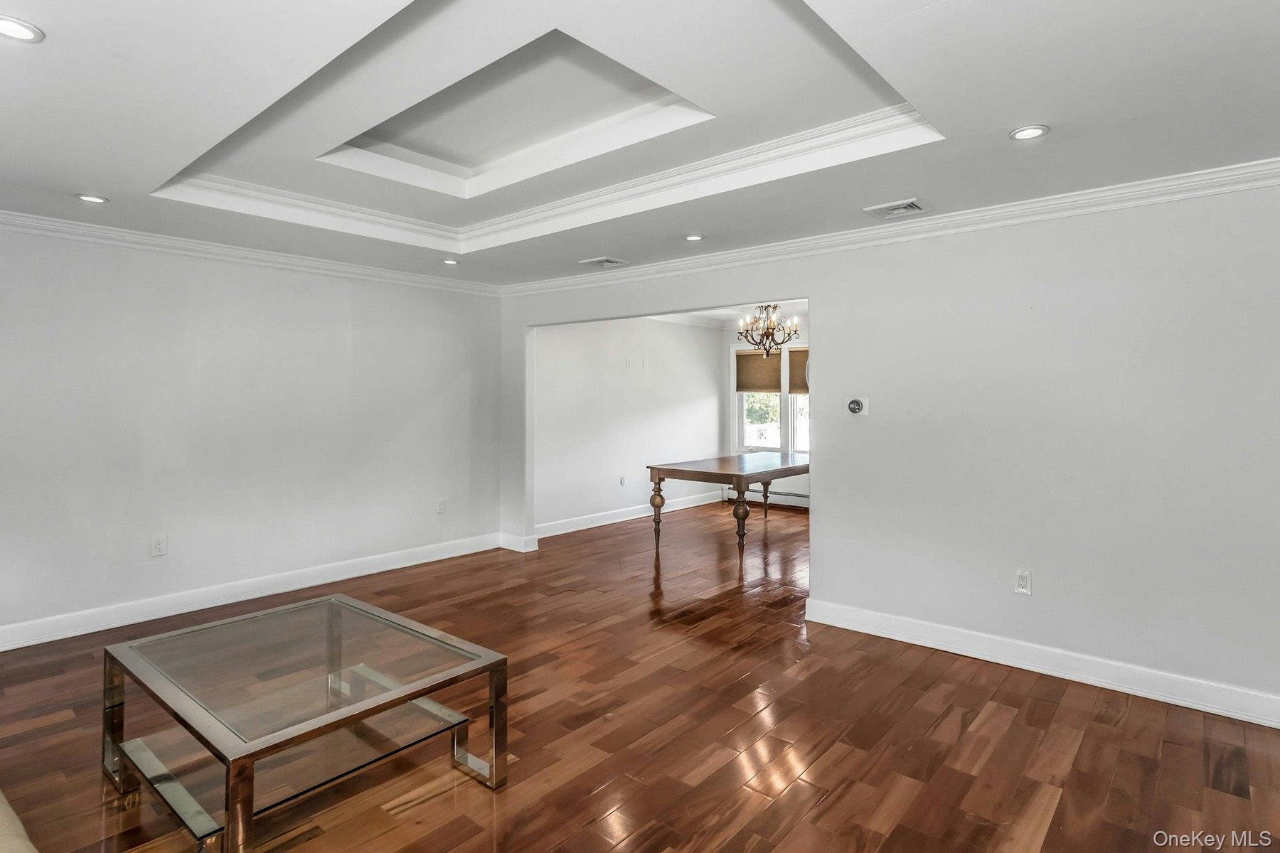 - Living area featuring a chandelier, recessed lighting, a tray ceiling, wood finished floors, and ornamental molding