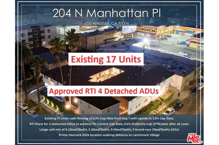 Price Reduction! Well maintained 17-unit building in prime Hancock Park/Larchmont Village area cash flowing at an amazing Current Cap Rate of 5.3% from day 1 with upside to 7.5% Cap Rate on Proforma. Approved RTI plans to add 4 detached ADUs to achieve a remarkable 7% Current Cap Rate, 9.2% Proforma Cap Rate, and only 277k/door after taking into account all constructions costs (~340k assuming $250/SF). Large unit mix of 6 (2bed/2bath) units, 2 (2bed/1bath) units, and 9 (1bed/1bath) units including 3 newly-built attached ADUs. Select units have been renovated and boast a high-end aesthetic with new modern cabinets, flooring, lighting, new bathrooms, stainless steel appliances, and major exterior capital improvements. Amenities include a renovated pool and courtyard with seating areas, on-site laundry facilities, secure entry, and parking for convenience. Individually metered for gas & electricity with soft-story retrofit already completed. Large 14,364 SF R3 TOC Tier 3 corner lot for future development potential. Located in the heart of Hancock Park just minutes away from Larchmont Village, Koreatown, Hollywood, and Melrose as well as many hip neighborhood attractions, restaurants, bars, and shops such as Wilshire Country Club, Paramount Studios, H Mart, Levain Bakery, Salt & Straw, and Great White, popping up all around the area.