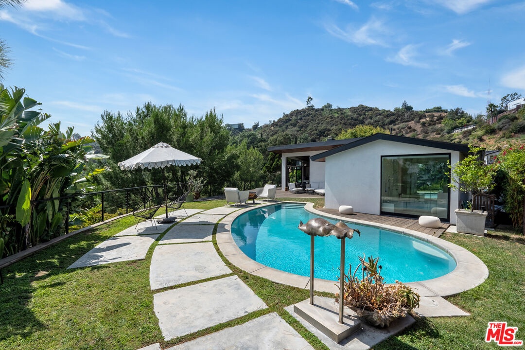 Ultra-private and nestled in nature on almost half an acre, this beautifully updated single-story home sits at the end of a cul-de-sac in a lovely pocket of Laurel Hills, offering soaring city and canyon views. This 3-bedroom, 4-bathroom residence features a bright and open floor plan with stunning finishes, including Walnut cabinetry, French oak wood floors, and Miele appliances throughout. Designed for entertainment, the sun-soaked formal living room with fireplace and dining room boast incredible views and Fleetwood sliding glass doors with auto shades that open to the rear yard with a large pool. An Ipe wraparound deck, spanning over 1200 square feet, provides access to the main suite, guest suite, kitchen, dining, and living rooms. The main suite includes luxurious appointments such as a custom wardrobe and spacious bath. An additional 2 en-suite bedrooms, powder room, laundry, and 2-car garage with Tesla charger and private trail complete the home. In close proximity to Beverly Hills and The Valley and has access to the Wonderland School District.
