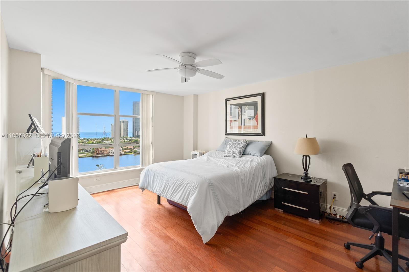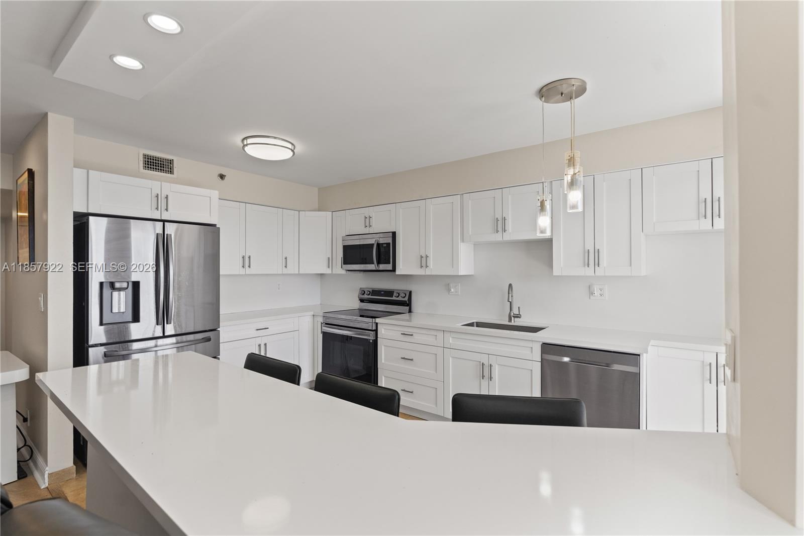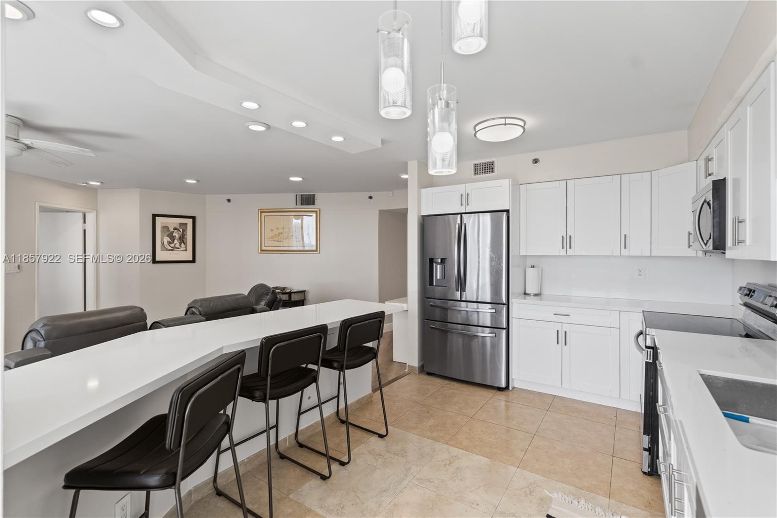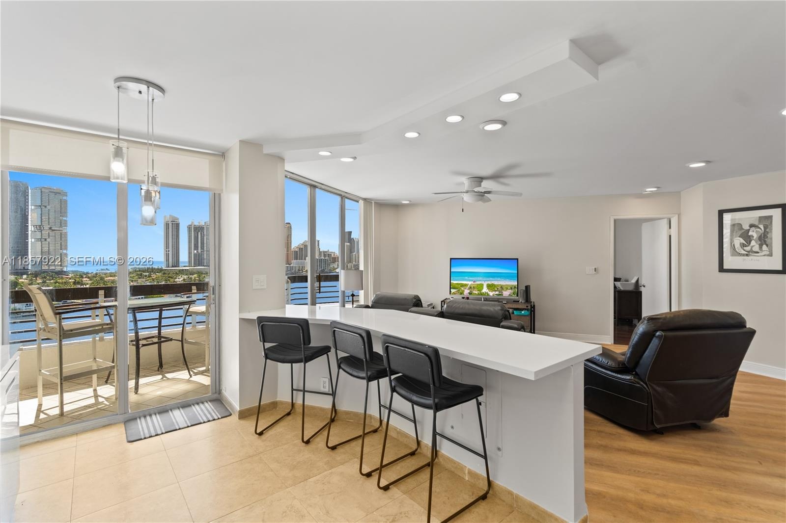Wake up to sweeping ocean and Intracoastal views that fill the home with natural light and set the tone for effortless waterfront living. This fully remodeled Aventura residence lives generously, with a versatile den ideal for a home office, guest space, or quiet retreat. Designed for both everyday comfort and entertaining, the open kitchen anchors the home with sleek finishes and high-end Samsung appliances, including an oven with a built-in air fryer. Thoughtful upgrades throughout—such as a 2023 HVAC system, 2023 Bosch water heater, new Samsung washer and dryer, custom closets, and designer lighting—enhance both function and style. The spa-inspired primary bath offers a jacuzzi and precision water temperature control, creating a relaxing, hotel-like experience at home.