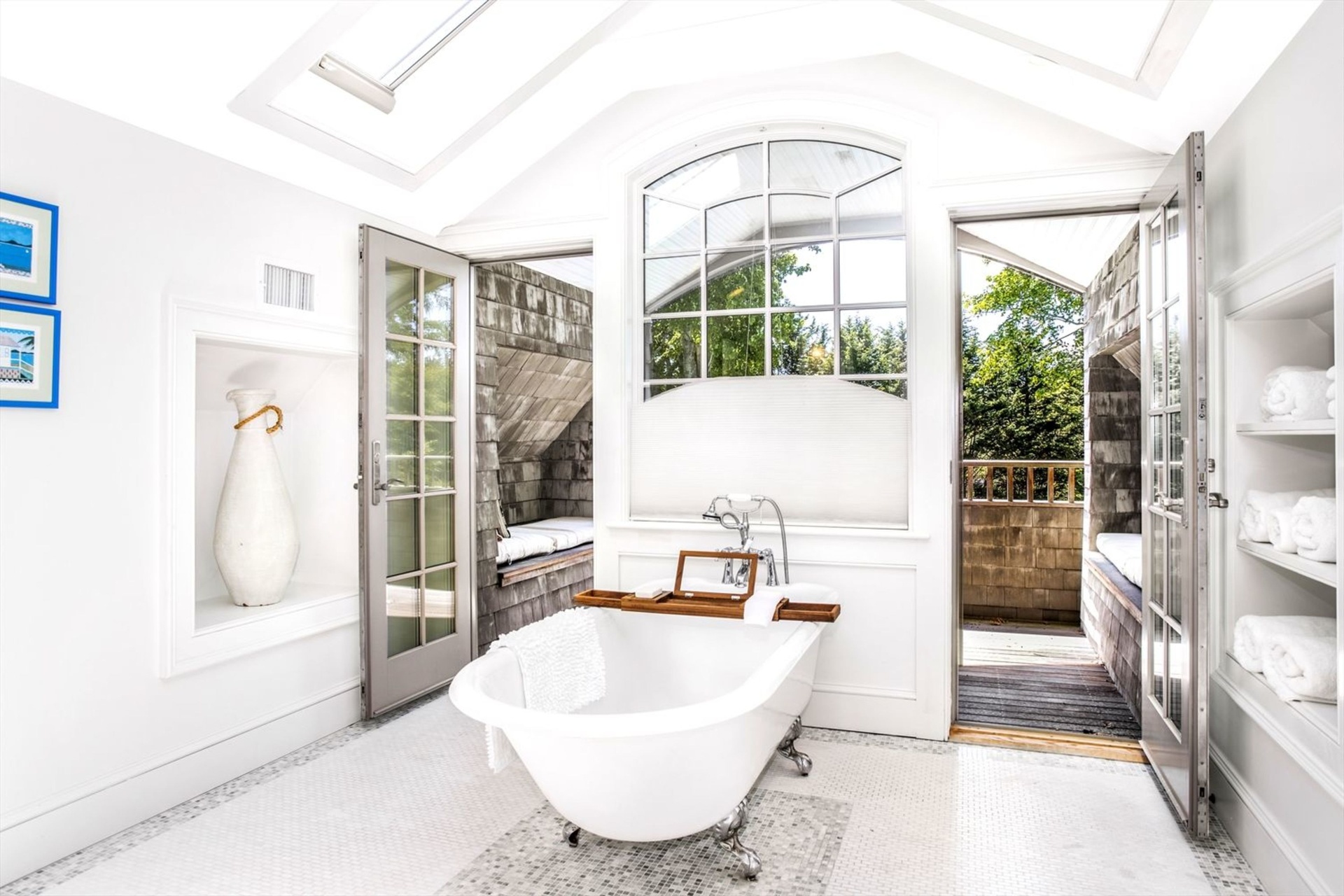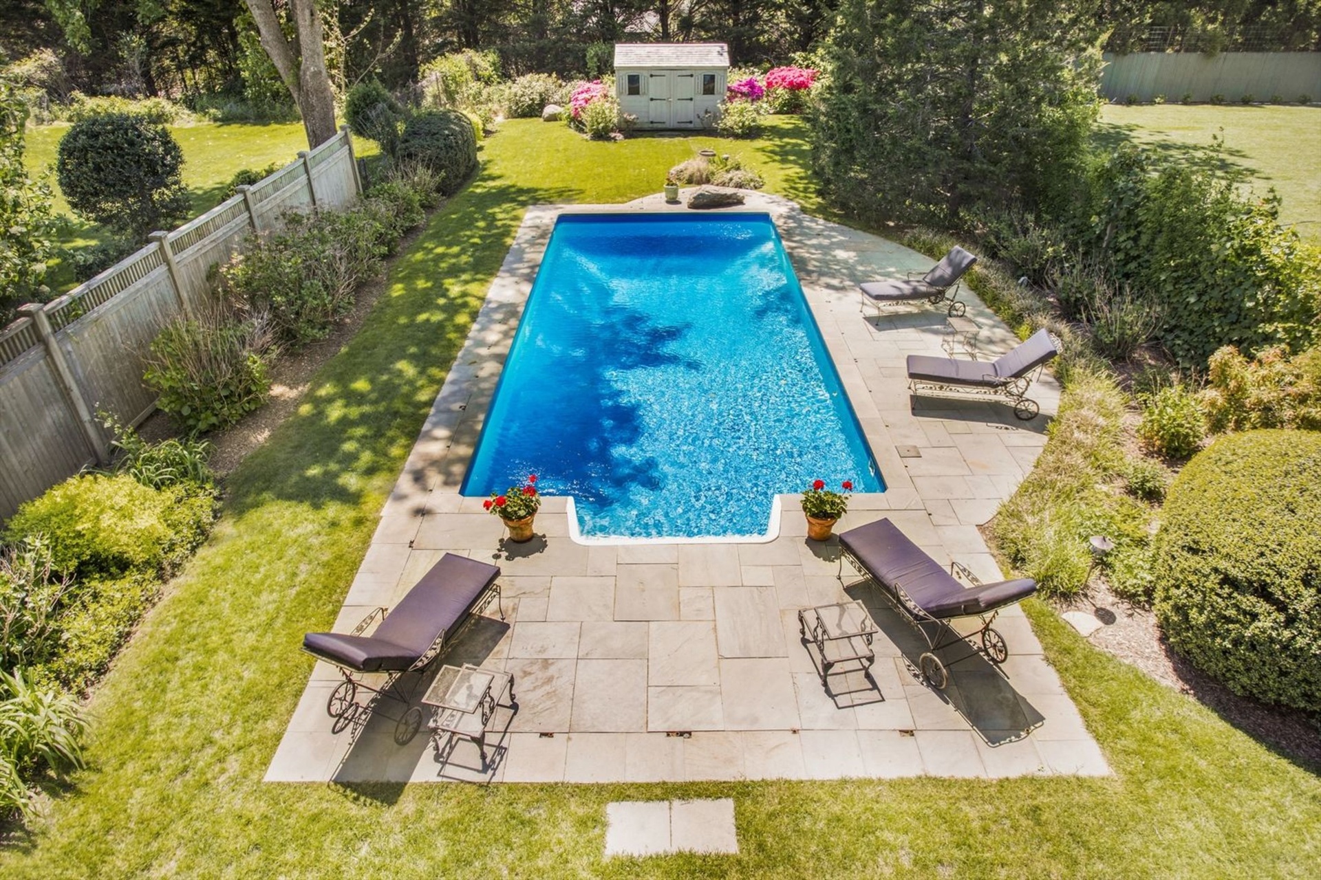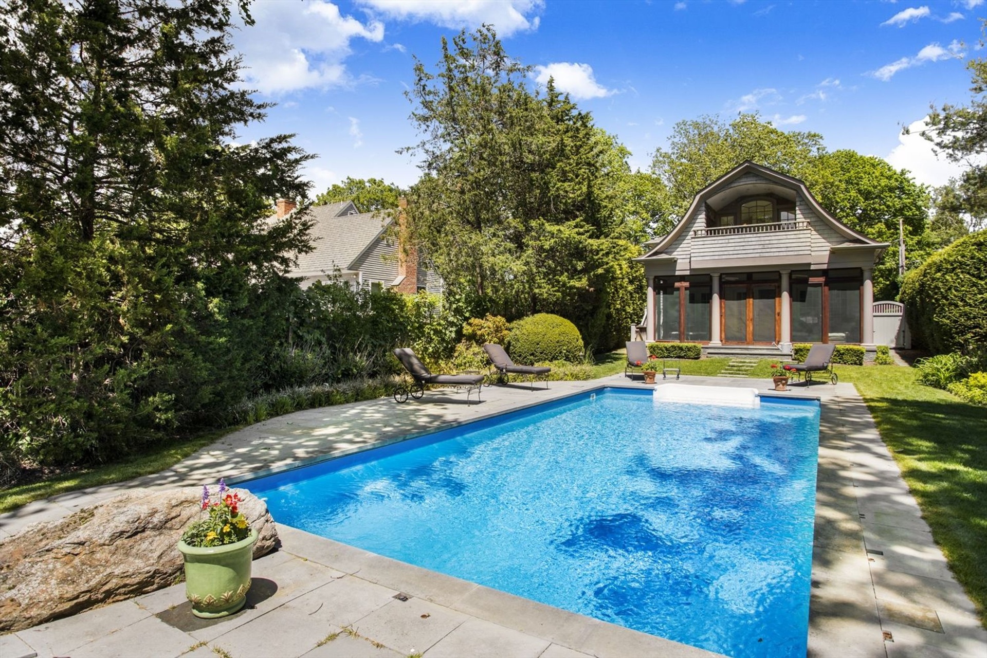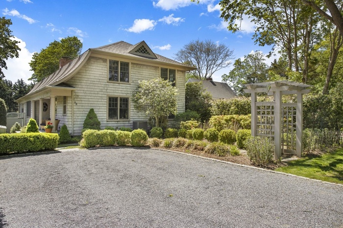 Not a stone has been left unturned in this handsome two story Traditional. Two master suites one down and one up with handsome built-in mahogany lounges on the second story deck overlooking the heated pool. A chef's kitchen and a double-sided fireplace, a formal dining room and a screened porch to while away the hours overlooking the glorious garden. Close to the Jitney and the train station five minutes away. Can't you hear the ocean already!.