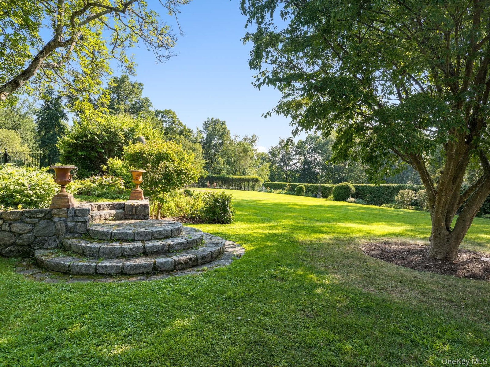- English garden with fountain and water feature