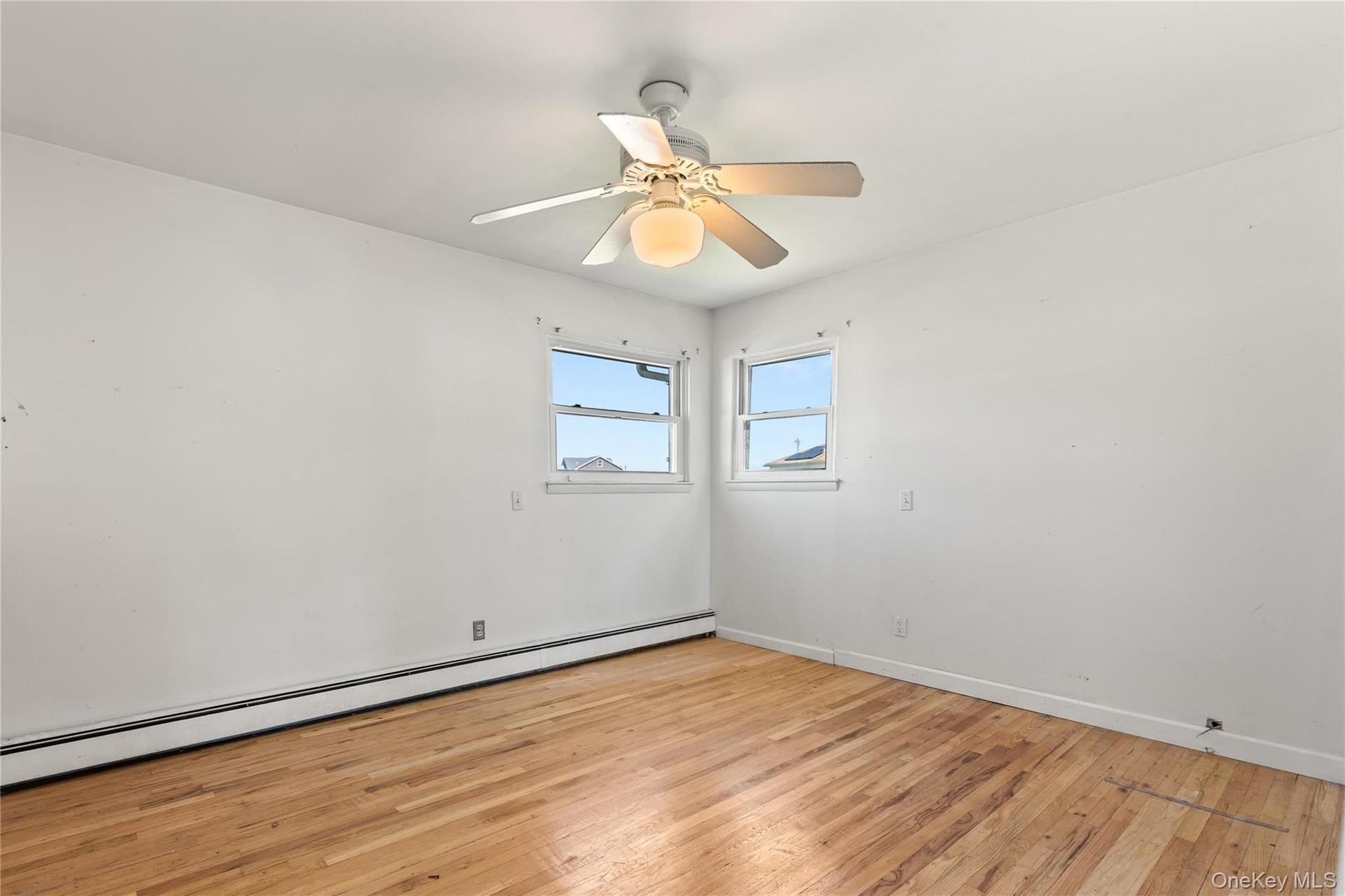 - Spare room featuring a baseboard heating unit, light wood-style floors, and ceiling fan
