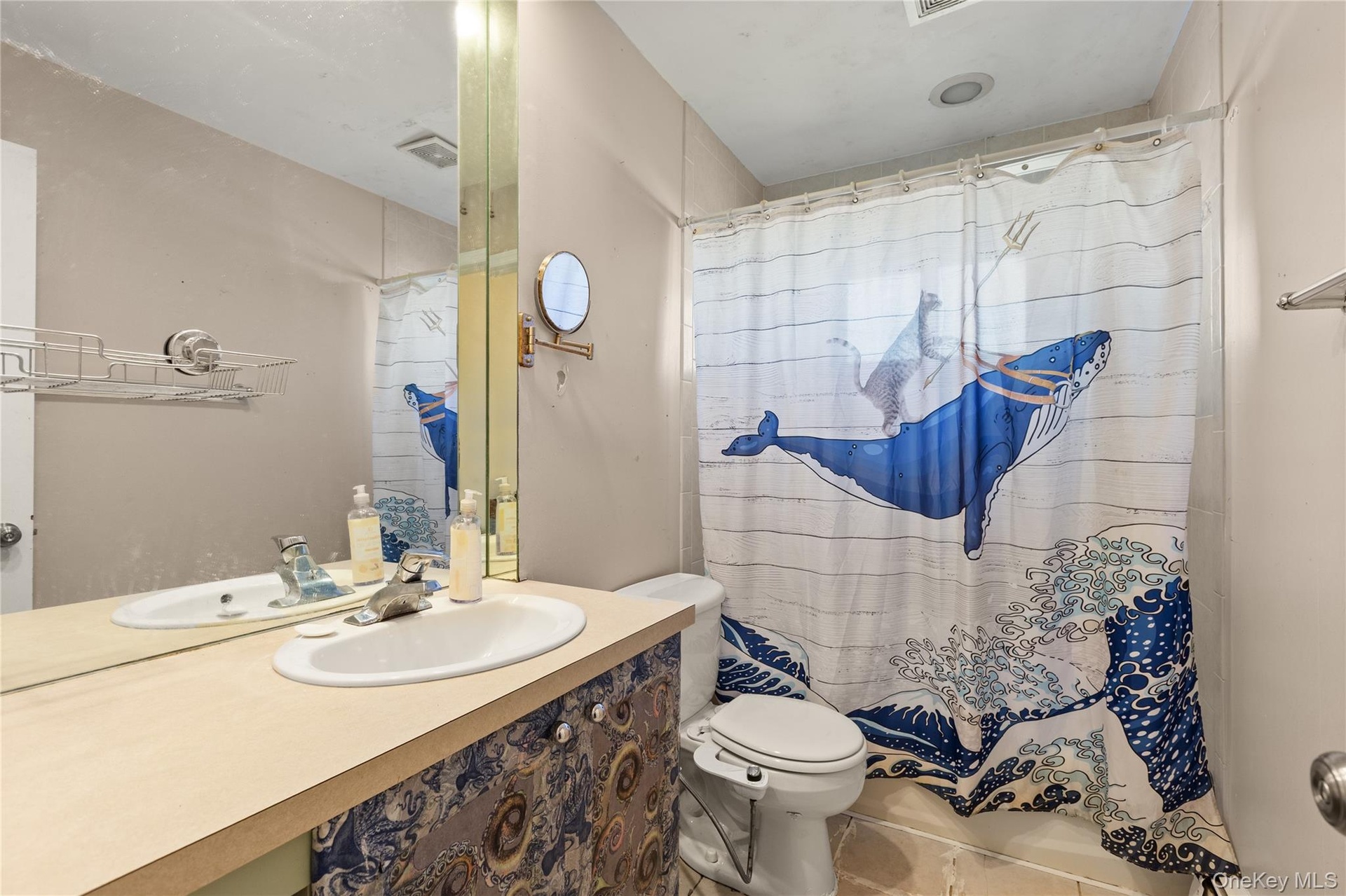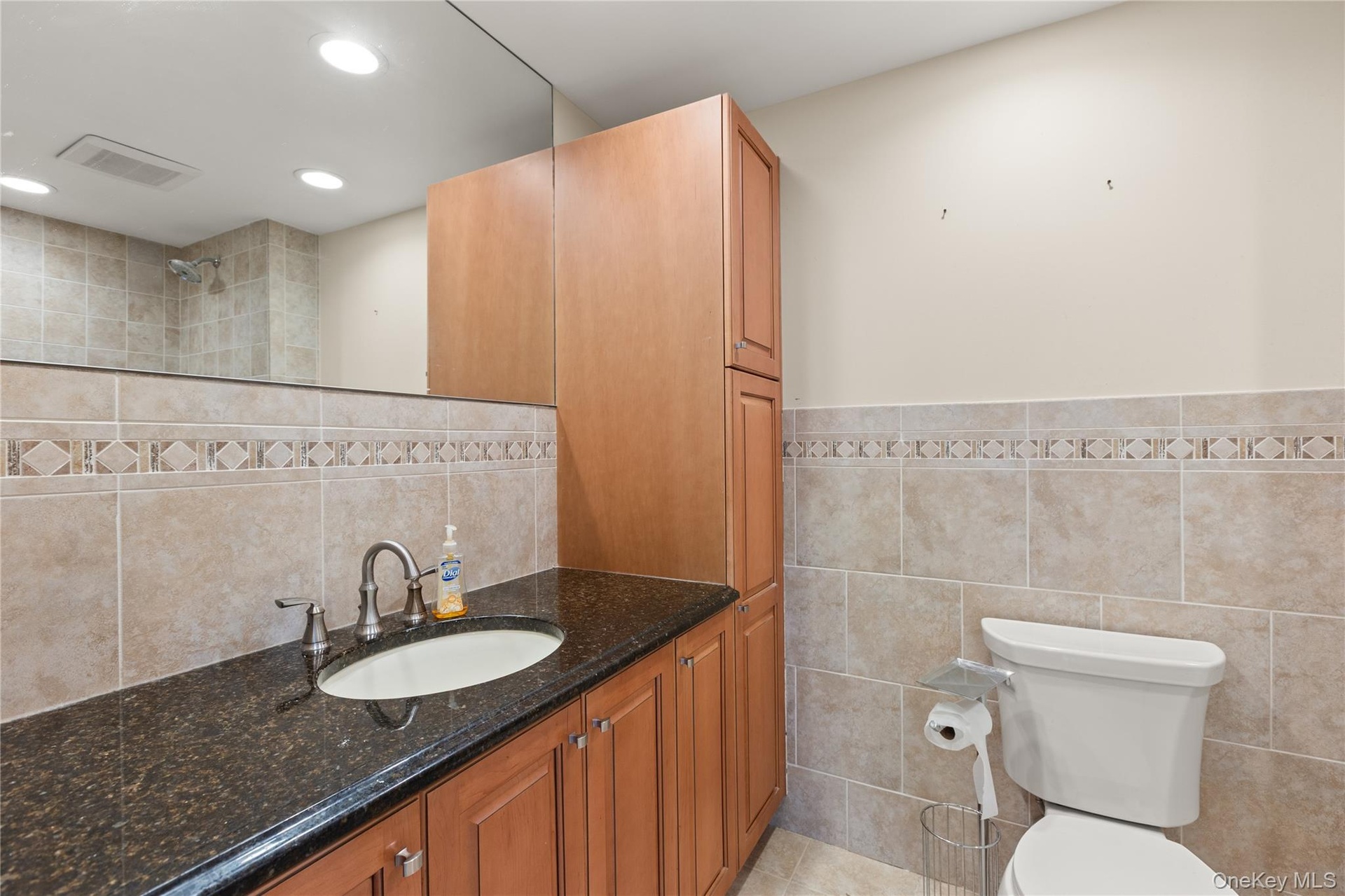 - Full bathroom featuring tile walls, vanity, wainscoting, recessed lighting, and a shower