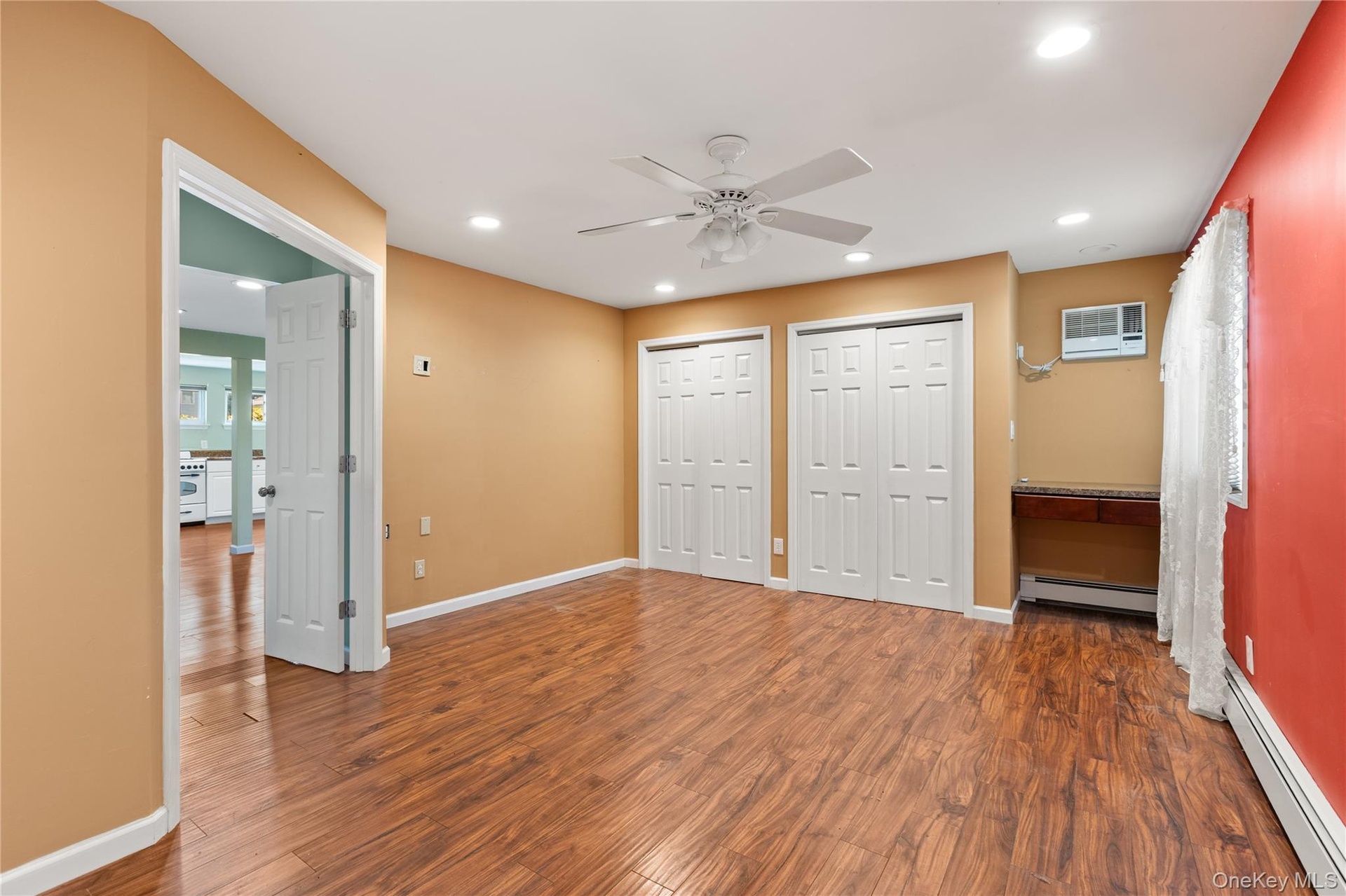 - Unfurnished bedroom with a baseboard heating unit, dark wood-style floors, two closets, recessed lighting, and ceiling fan