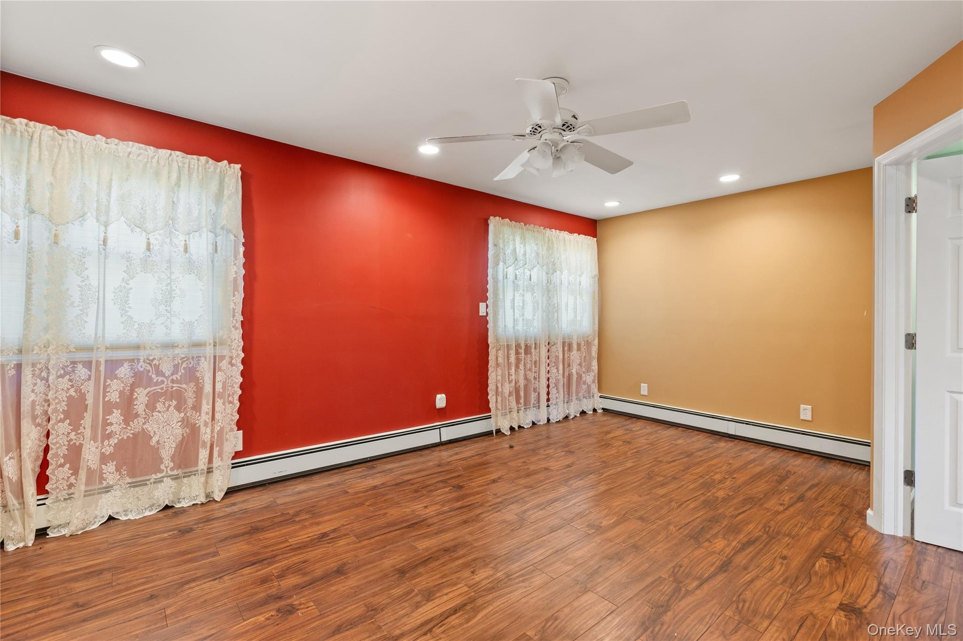 - Empty room with a baseboard heating unit, wood finished floors, recessed lighting, and a ceiling fan