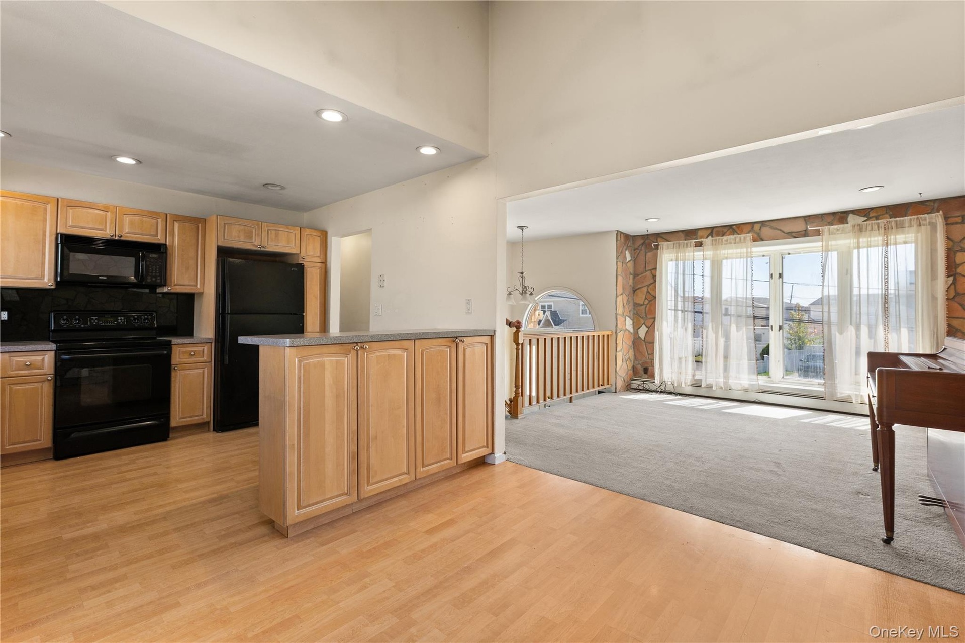 - Kitchen with black appliances, recessed lighting, open floor plan, light brown cabinetry, and decorative backsplash