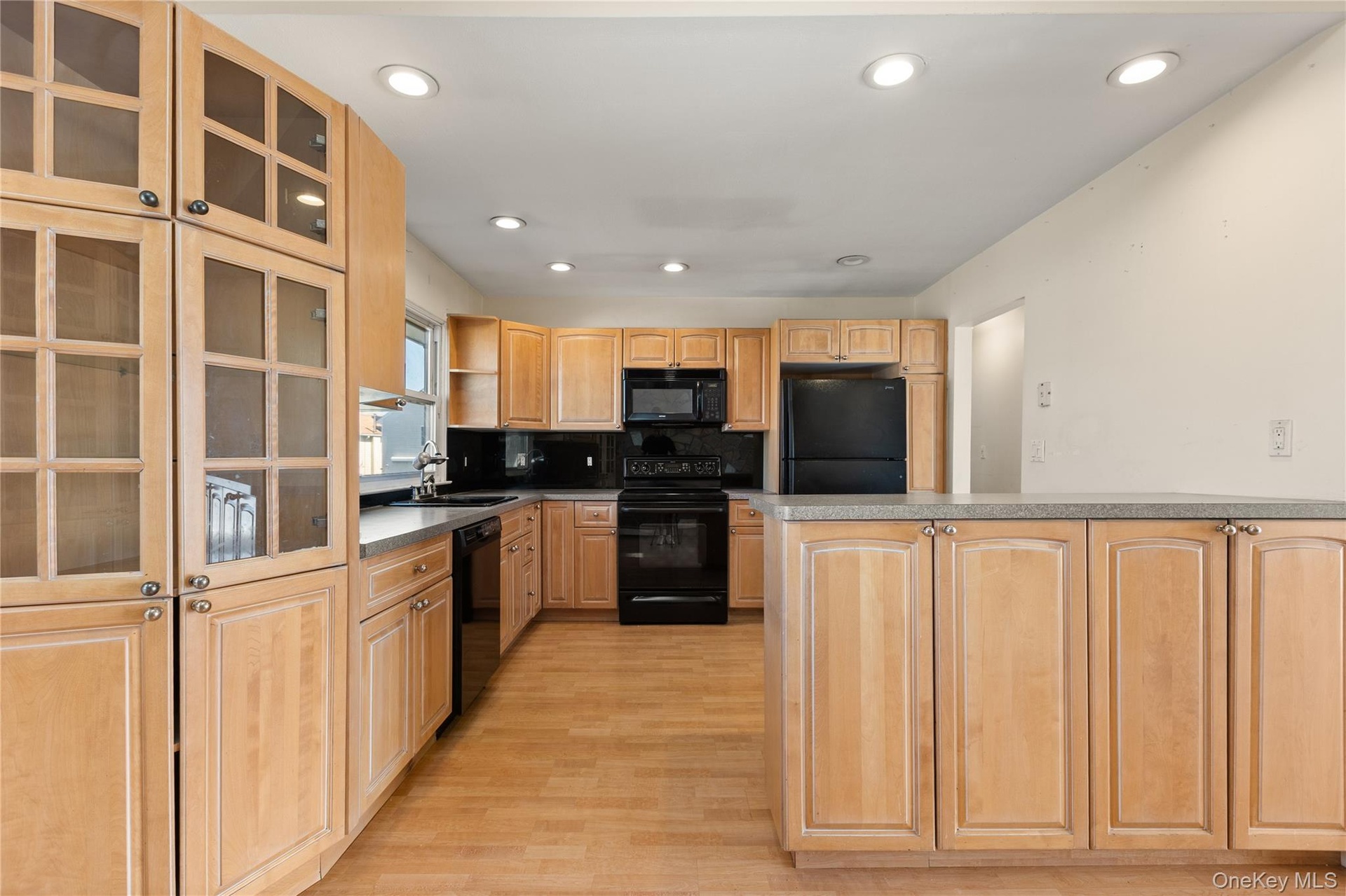 - Kitchen with black appliances, glass insert cabinets, recessed lighting, light wood-style floors, and backsplash