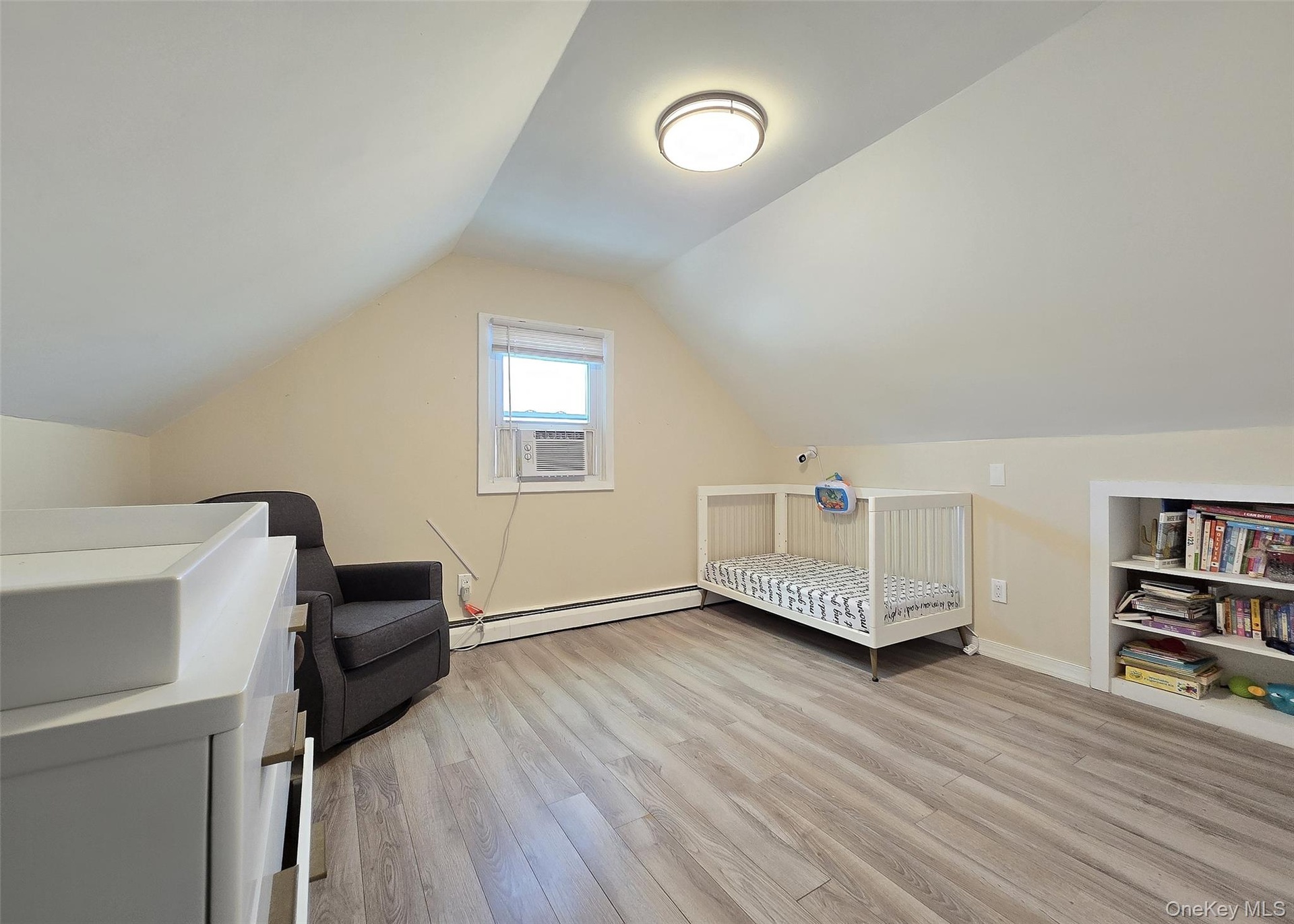 - Bedroom with light wood-style flooring, lofted ceiling, a baseboard radiator, a nursery area, and cooling unit
