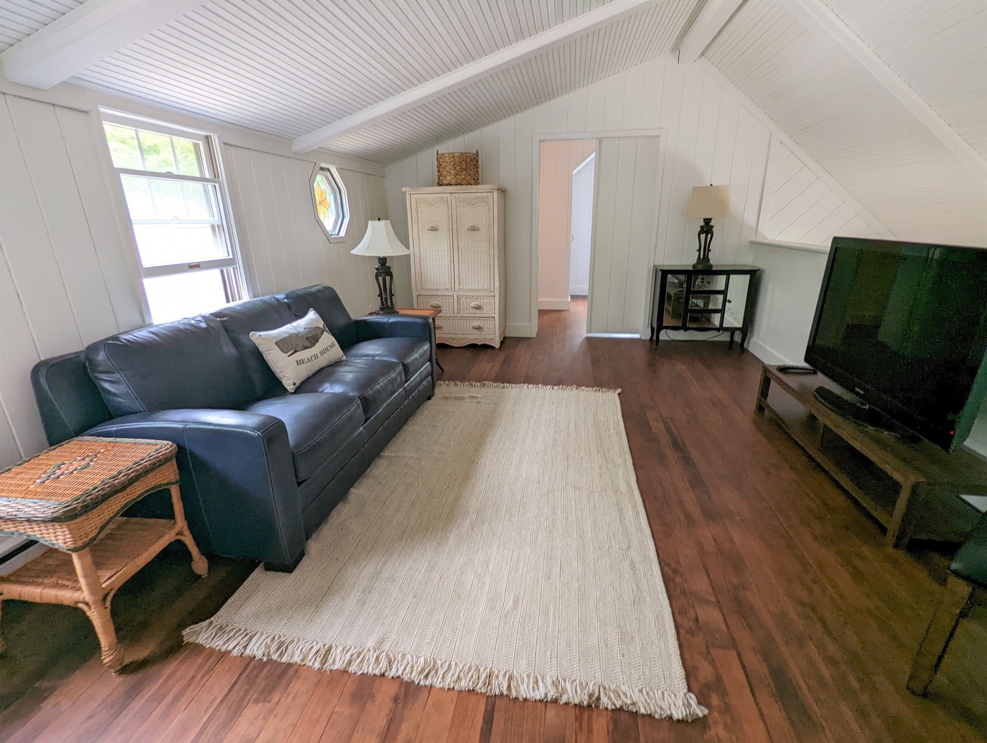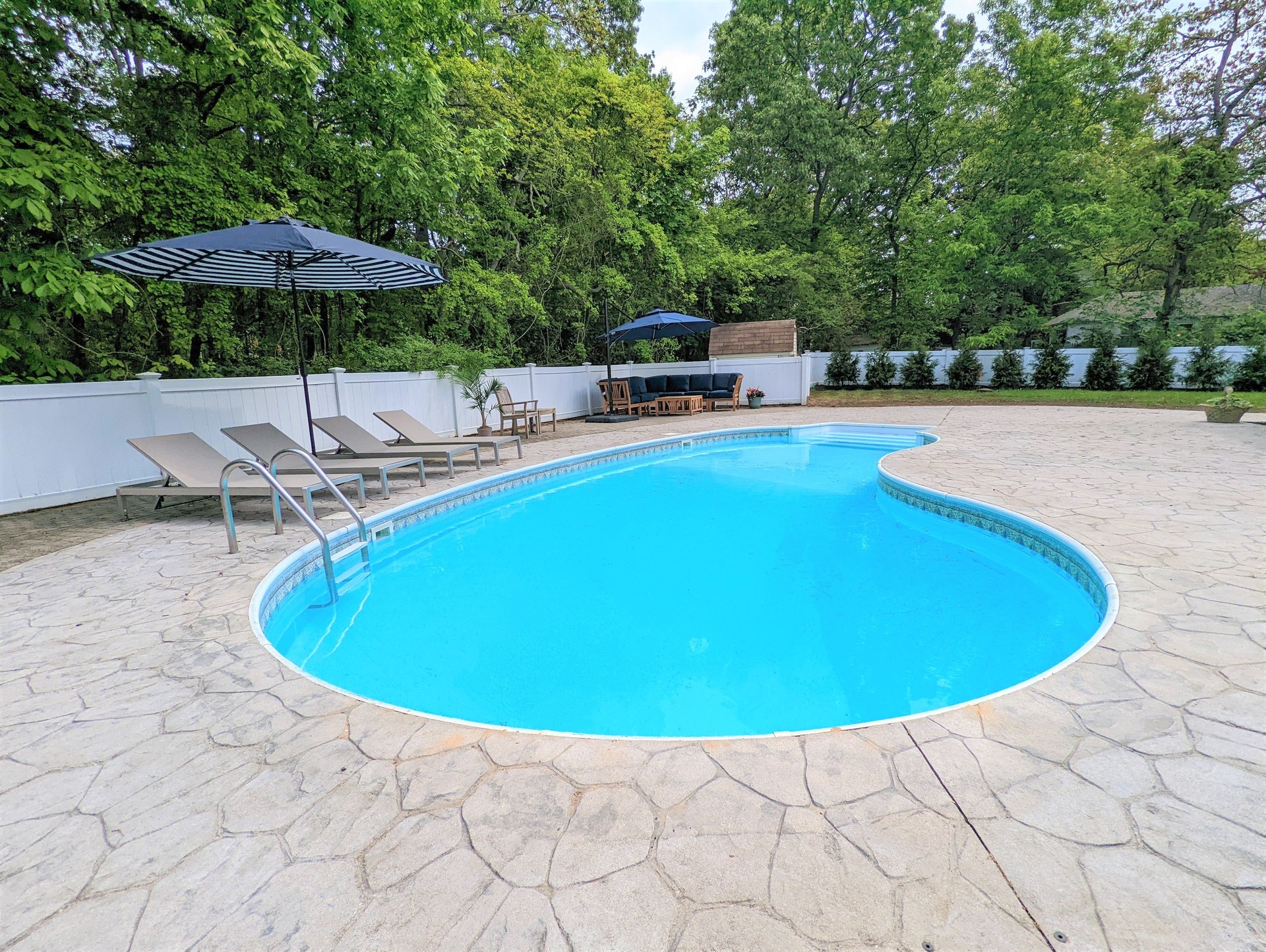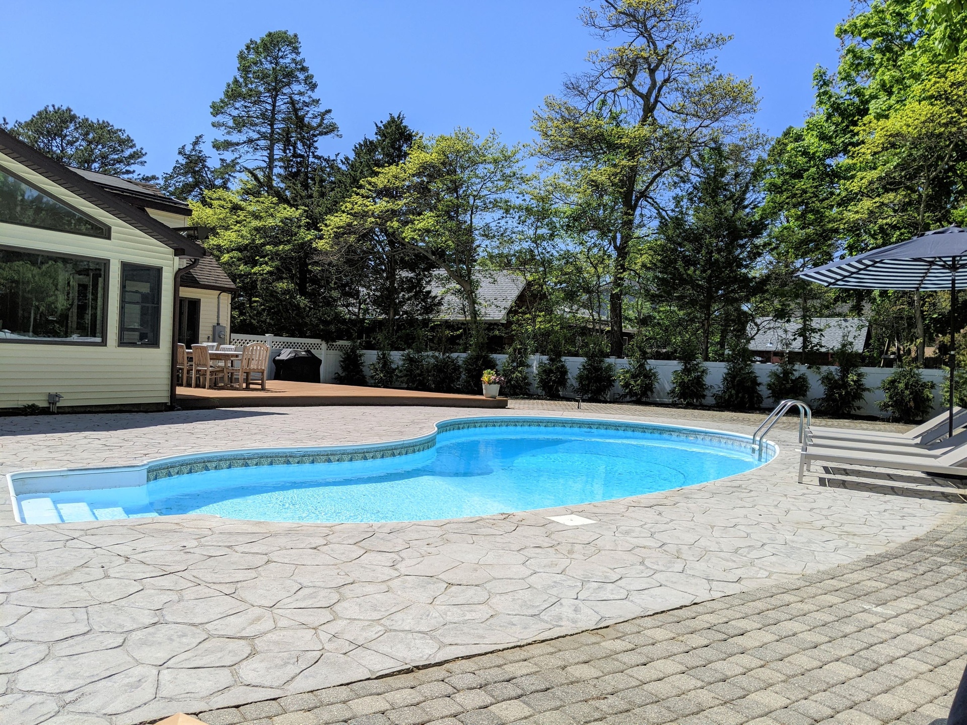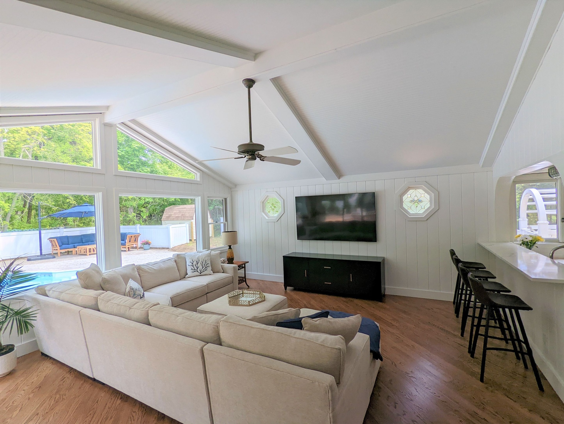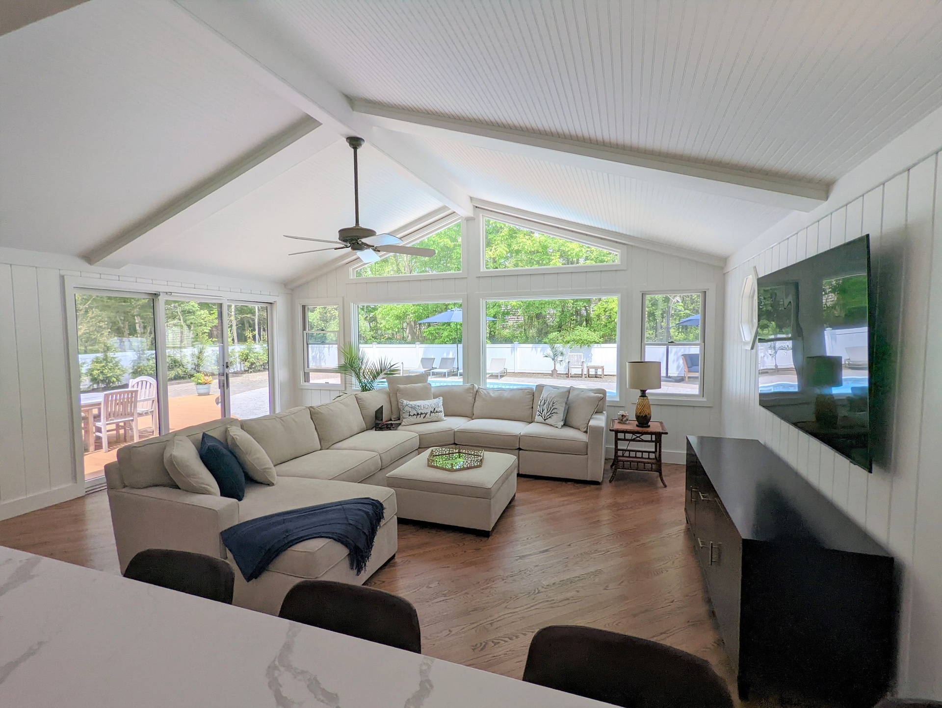 Recently renovated and furnished 3 bedroom, 2 full bathroom beach house in Southampton with upgraded amenities like high-speed internet, heated pool, and easy 3-minute beach access. Spacious living room overlooking the pool with a large sectional couch and a 75-inch television. The covered front porch has rocking chairs and a table for relaxation. The upstairs lounge area has a pull-out couch and TV for extra hangout space. Home office station available upon request, as well as the crib. Fully-stocked kitchen with brand-new stainless steel appliances and quartz countertops. All bedrooms have TVs, linens, and towels. Recently updated laundry room. The outdoor patio area has an 8-person teak table, lounge chairs, an outdoor sofa, Tommy Bahama beach chairs, and umbrellas. Private access to community tennis courts, basketball court, and marina.