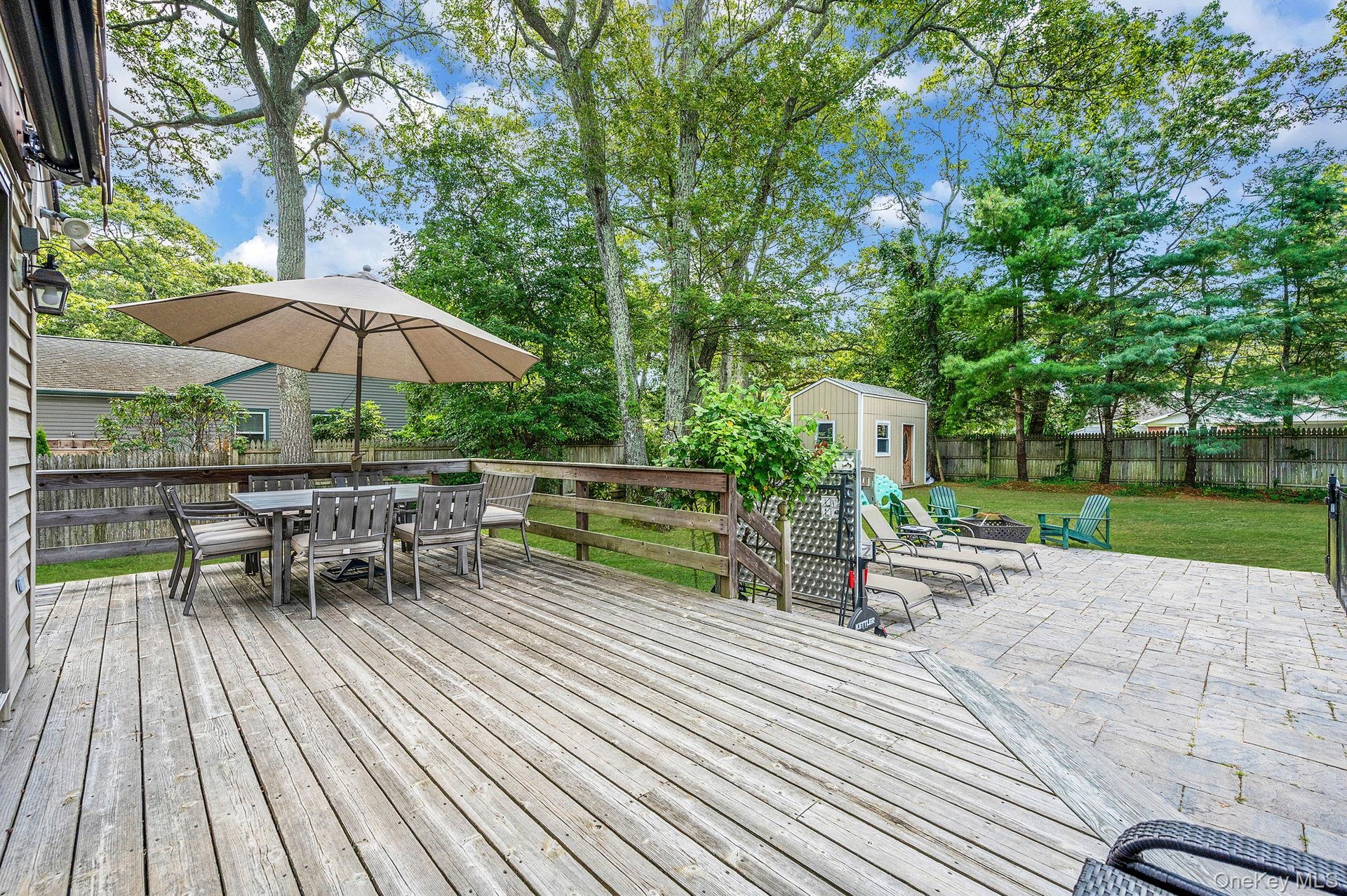 - Wooden deck featuring outdoor dining area, a fenced backyard, a shed, and a patio