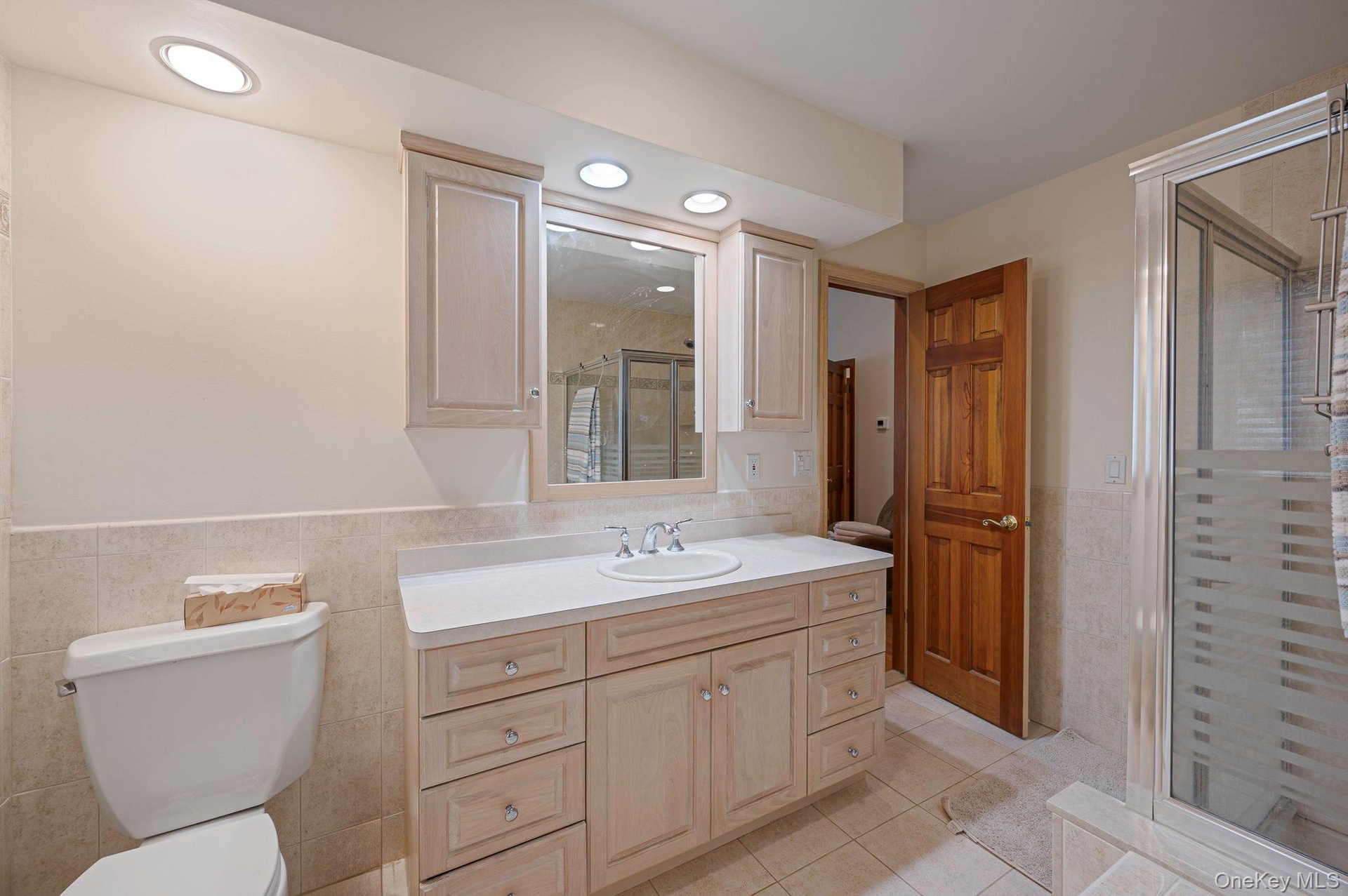 - Bathroom with tile walls, a wainscoted wall, light tile patterned floors, a stall shower, and vanity