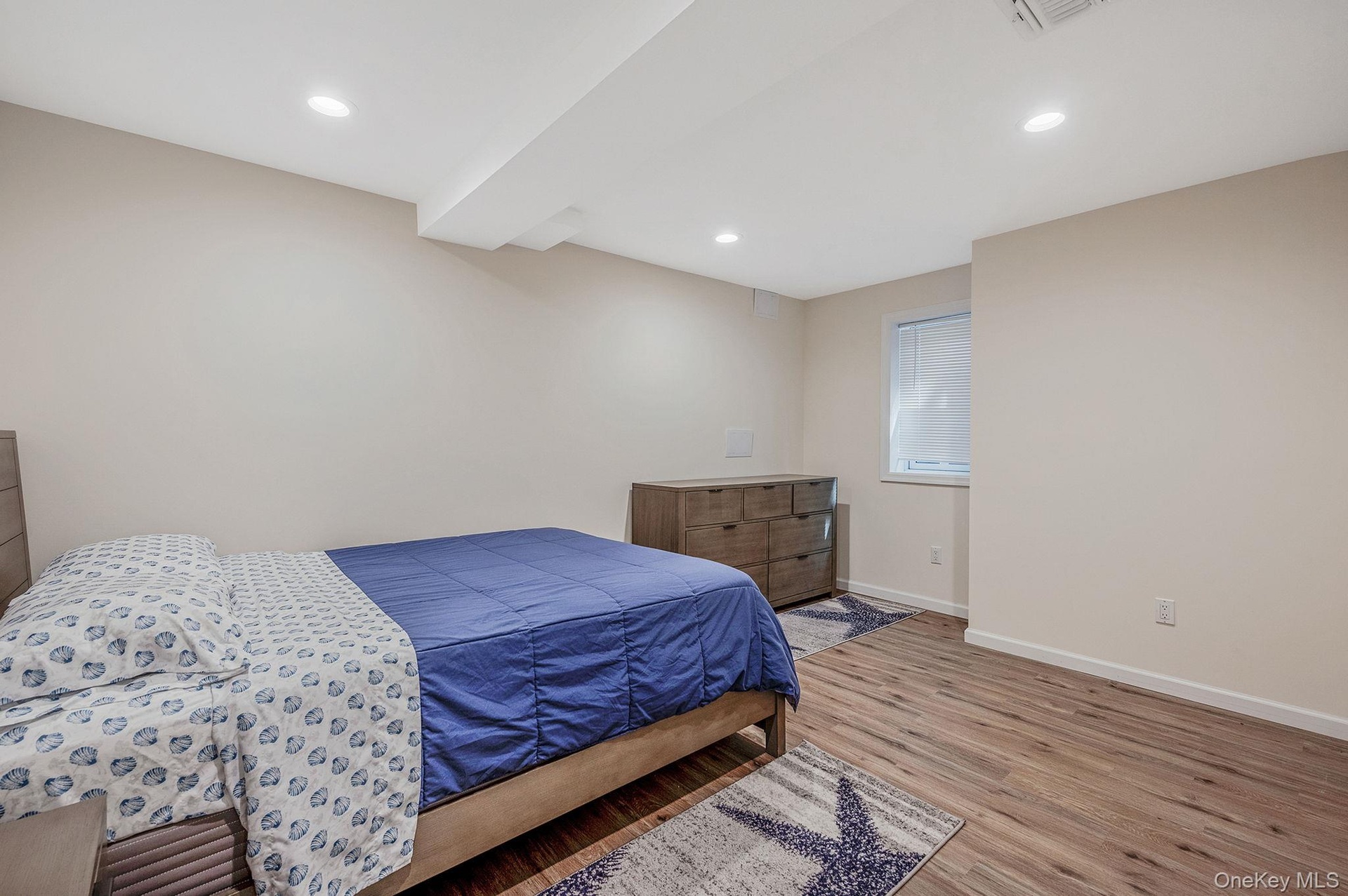 - Bedroom with wood finished floors, recessed lighting, and beam ceiling