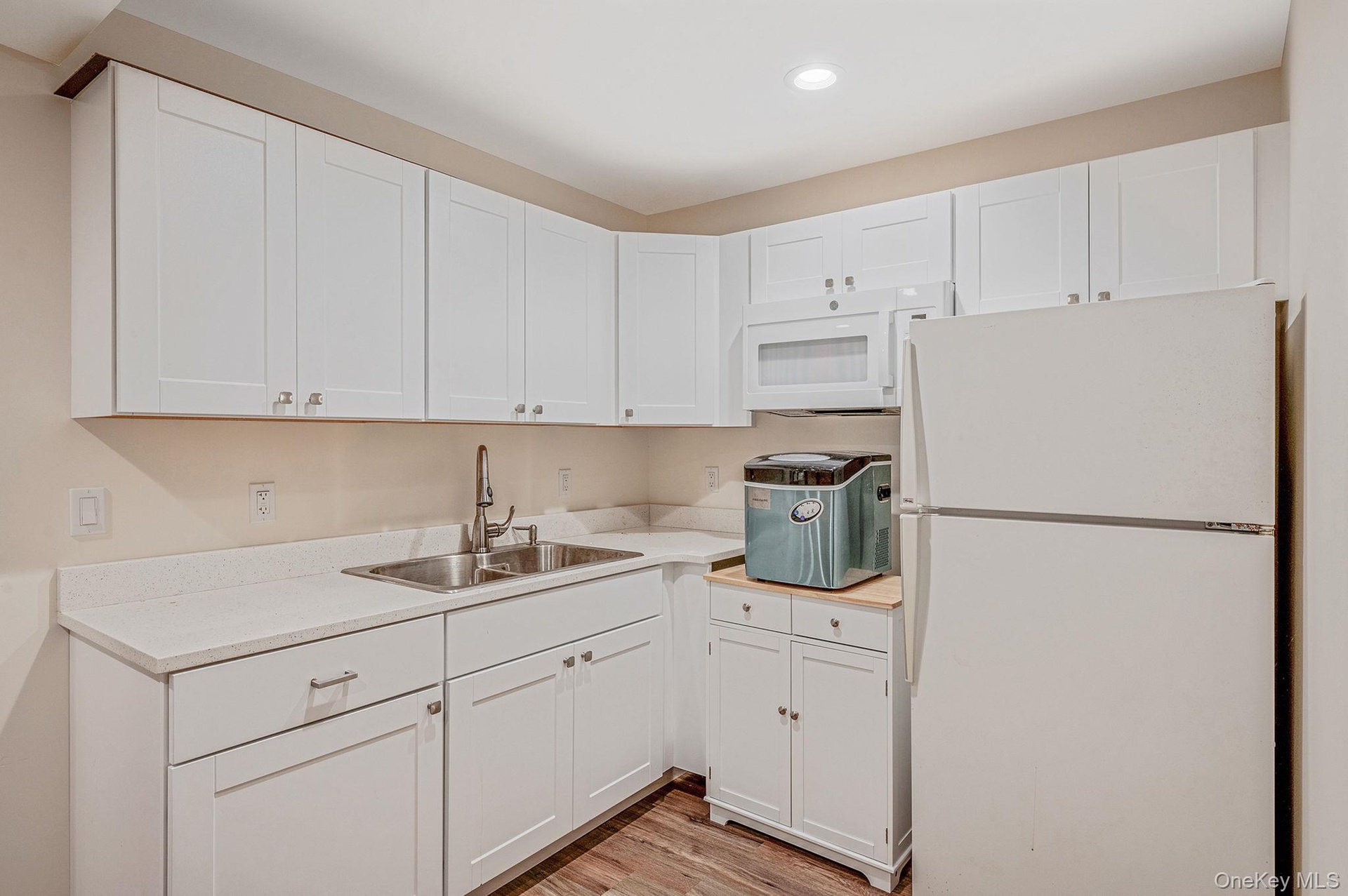 - Kitchen featuring white appliances, light countertops, white cabinetry, light wood finished floors, and recessed lighting