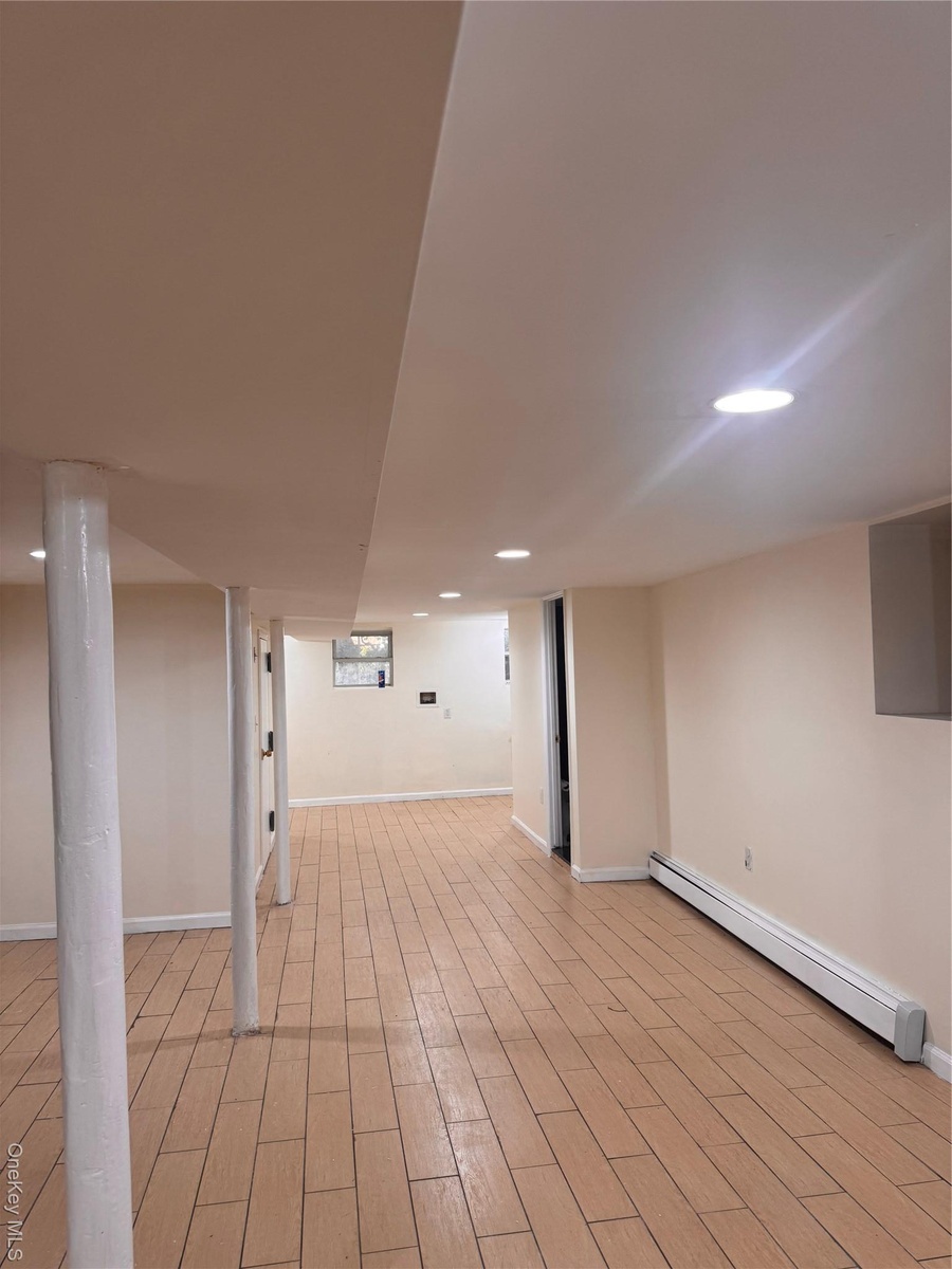 - Below grade area with baseboard heating, recessed lighting, and light wood-style floors