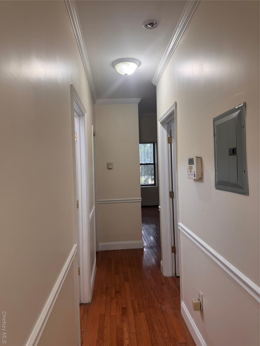 - Corridor featuring crown molding, dark wood-style floors, and electric panel