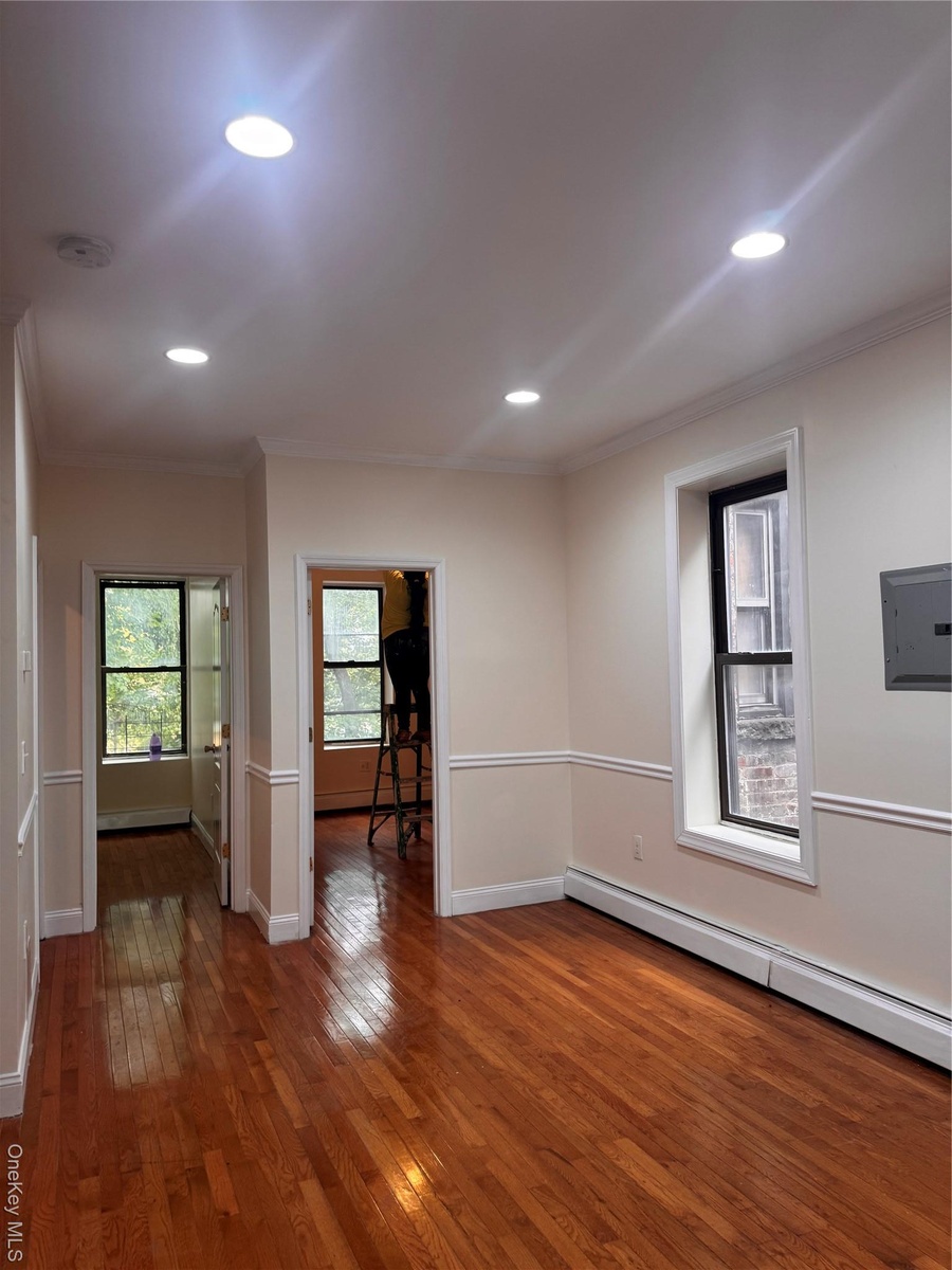 - Spare room with a baseboard radiator, wood-type flooring, ornamental molding, recessed lighting, and healthy amount of natural light
