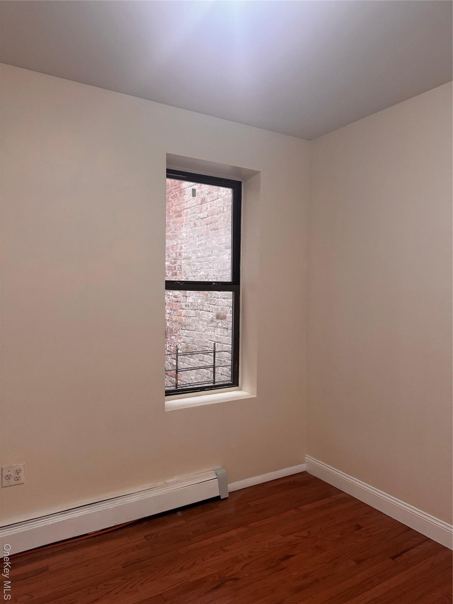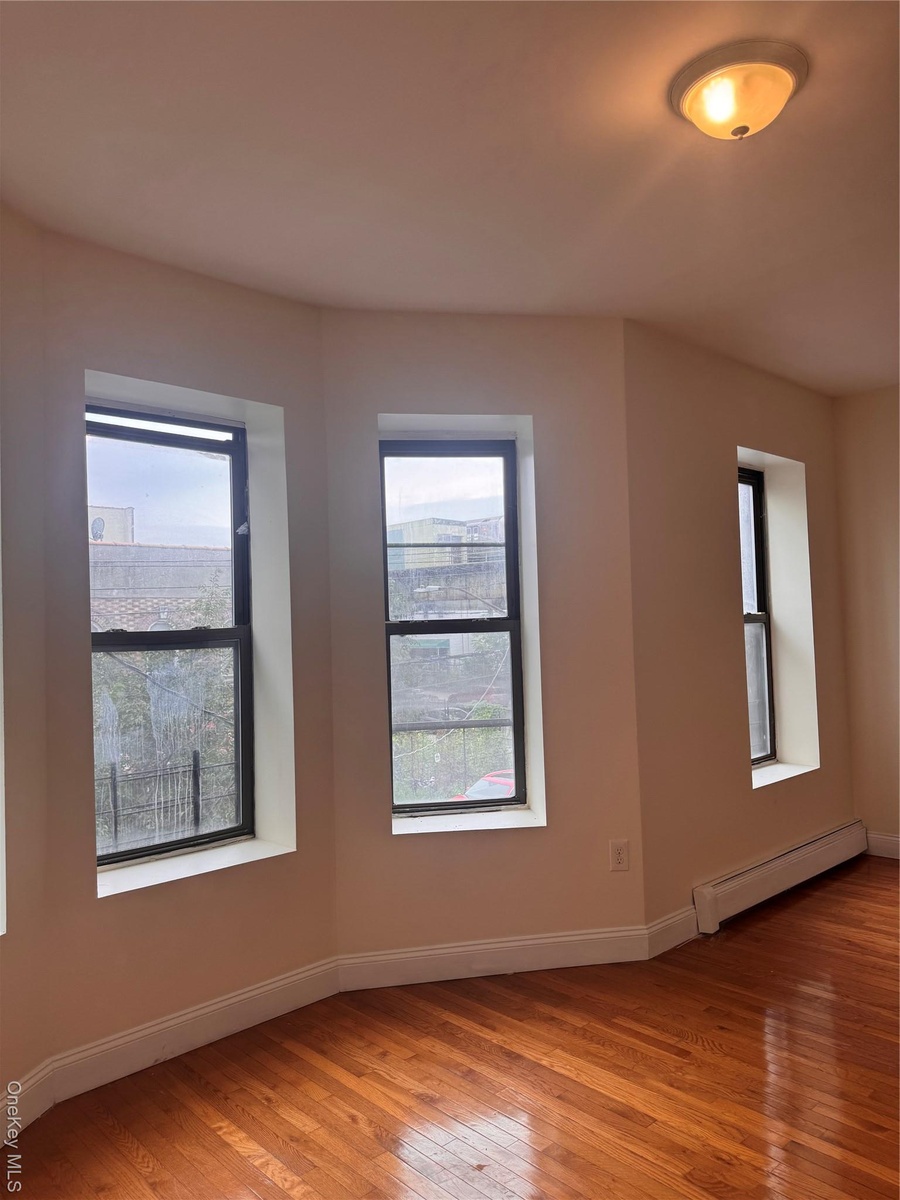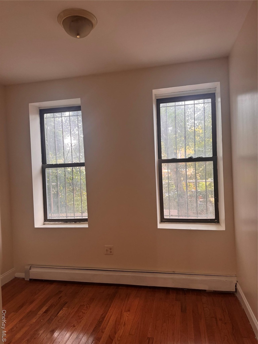 - Unfurnished room with wood-type flooring and a baseboard heating unit